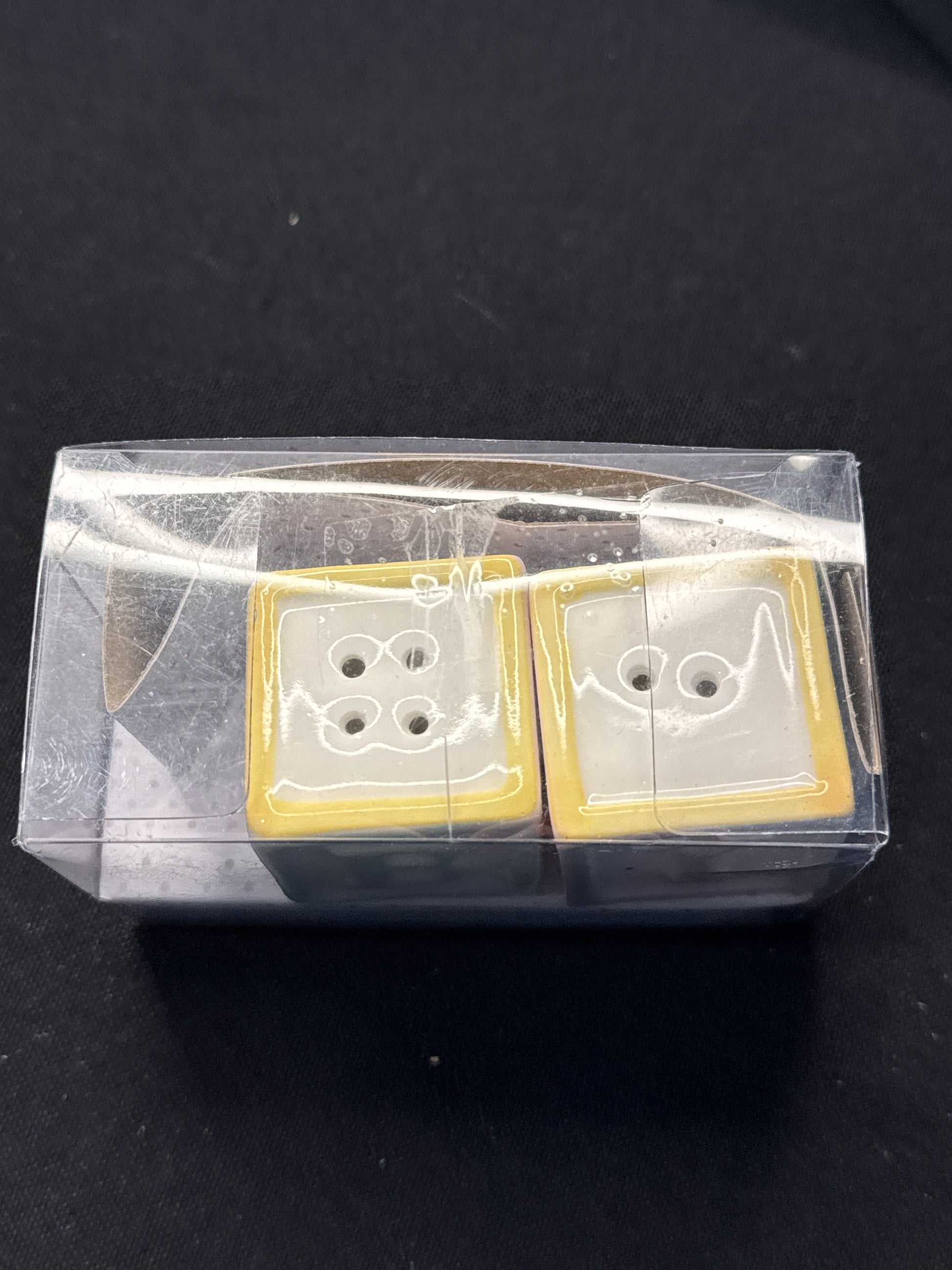 Baby Block Salt & Pepper Shakers Porcelain Alphabet Blocks 1.5" Tall New in Box. Excellent condition. no chips or cracks. Currently have 2 in stock.