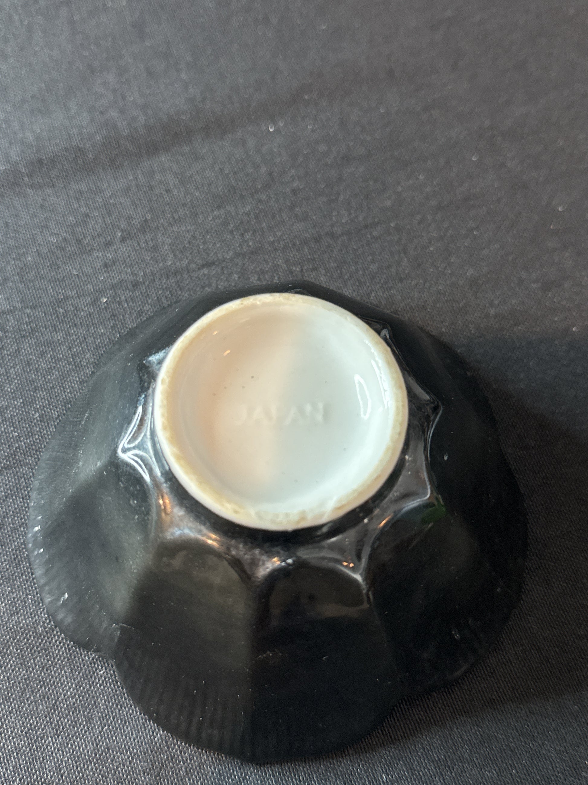 Black Rice Bowl MCM Lotus Shaped Ceramic Made in Japan. Excellent condition, no chips or cracks. Measures 2.25" Tall and 4.5" wide at top.