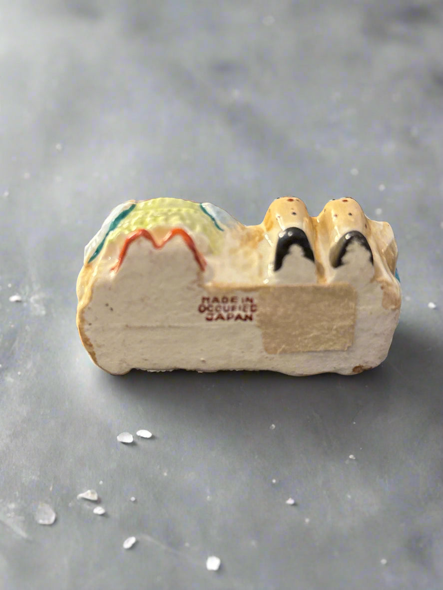 Ceramic Vintage Boy and Girl Salt & Pepper Shakers 3 Pieces with Stand 3" Tall. Excellent condition, no chips or cracks. Made in Occupied Japan