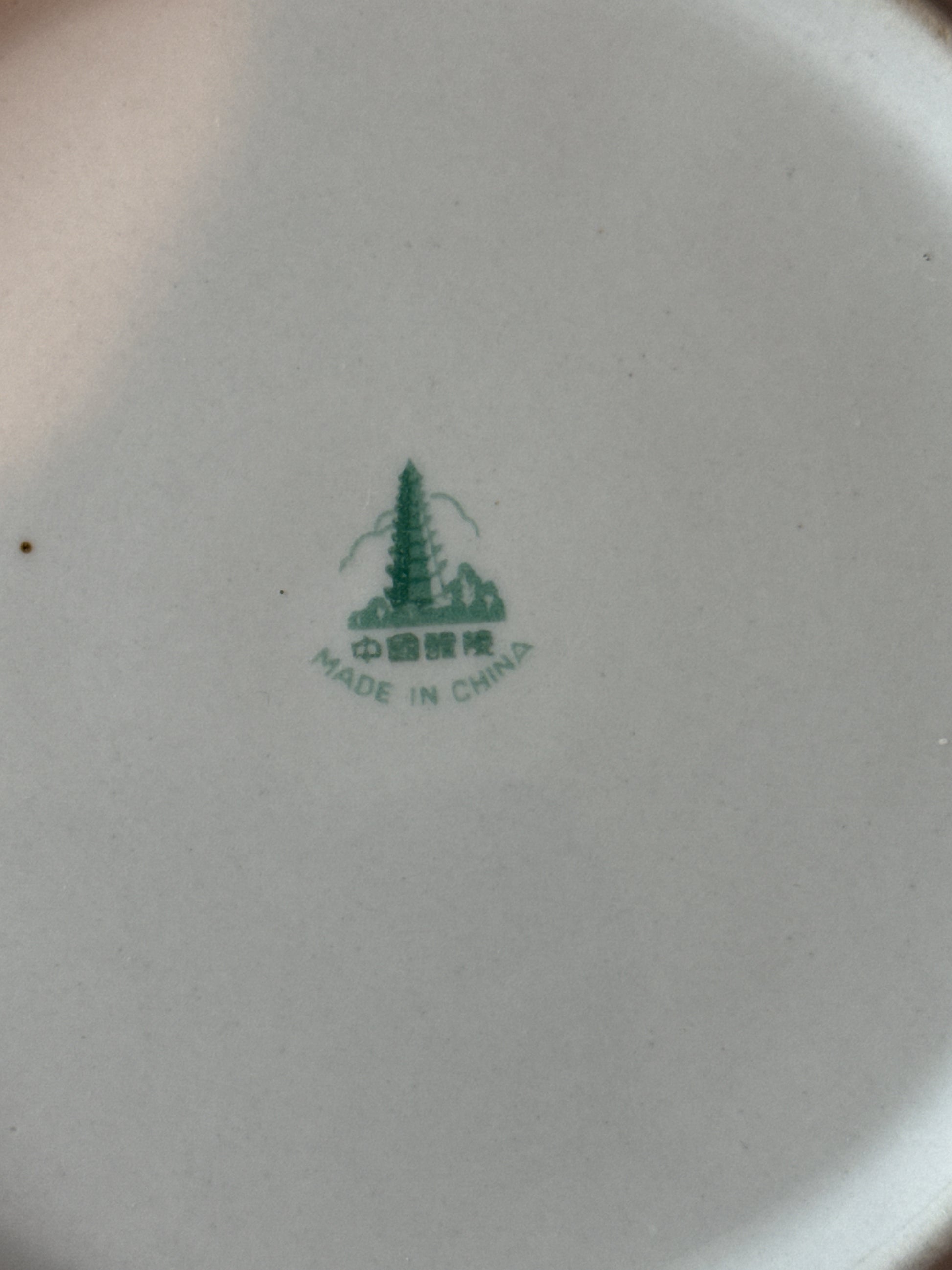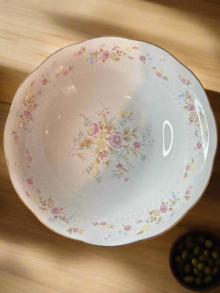 China 9" Bowl Porcelain Nanjing Pagoda Mark Floral Rose Gold Rim 2 5/8" Tall. Excellent condition, no chips or cracks.