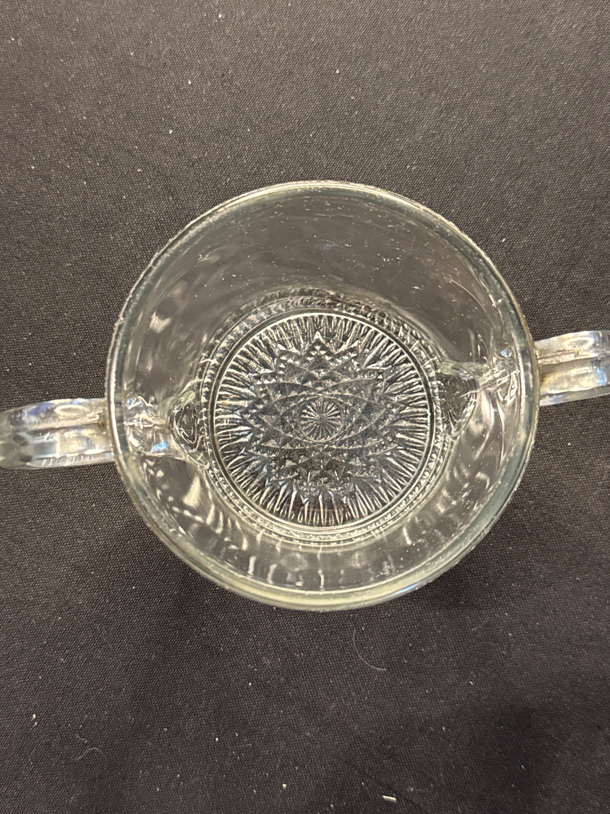 Clear Depression Glass Sugar Dish Sunburst Design Double Handled Glassware 4 1/8" Tall. Very good condition with some wear shown, no chips or cracks.