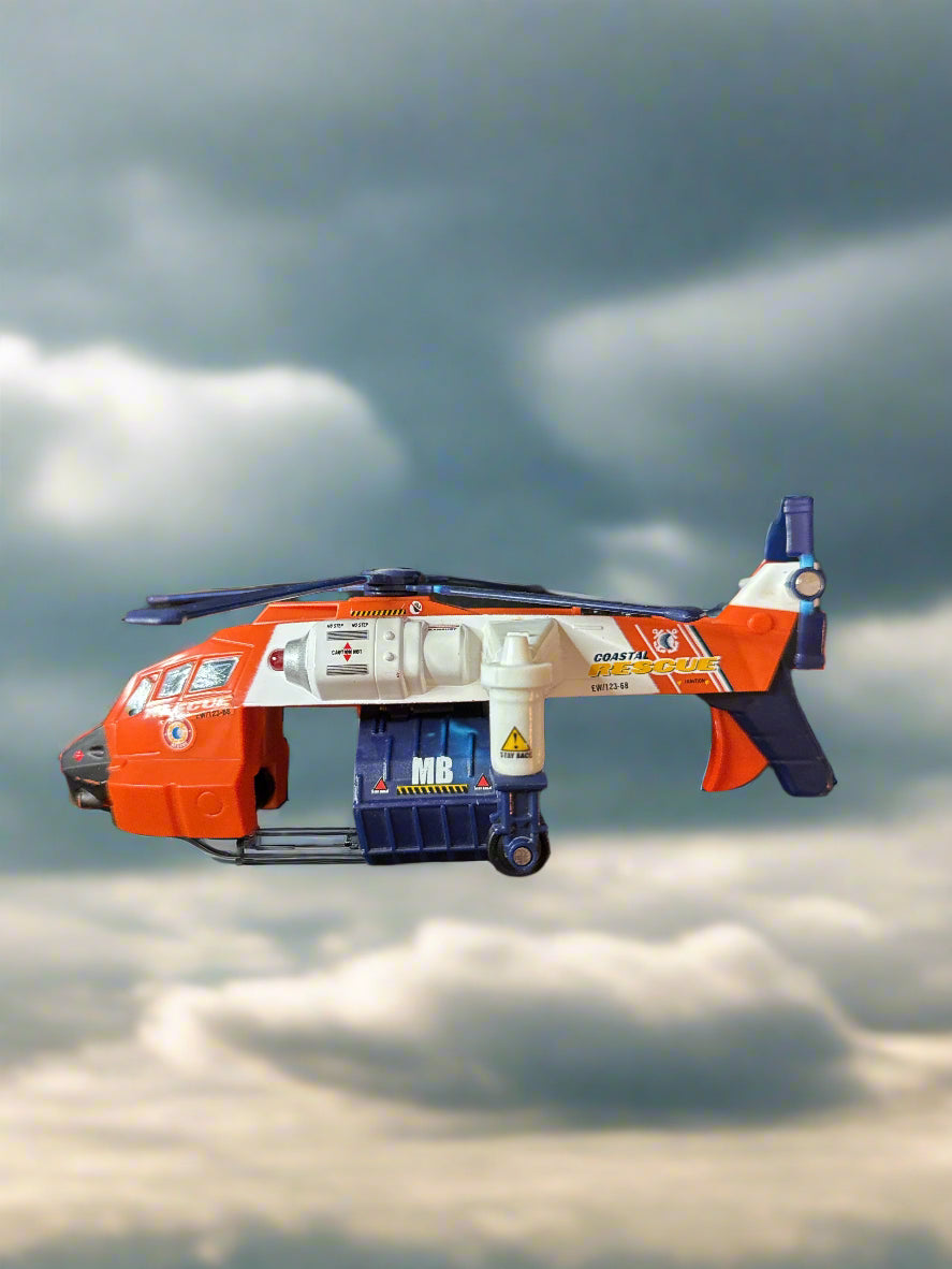 Coast Guard Plane 10" Long 11" Wingspan and Coastal Rescue Helicopter 7" Long Toys. Both have finger triggers that activate either the wheels on the plane or the grabber on the helicopter.