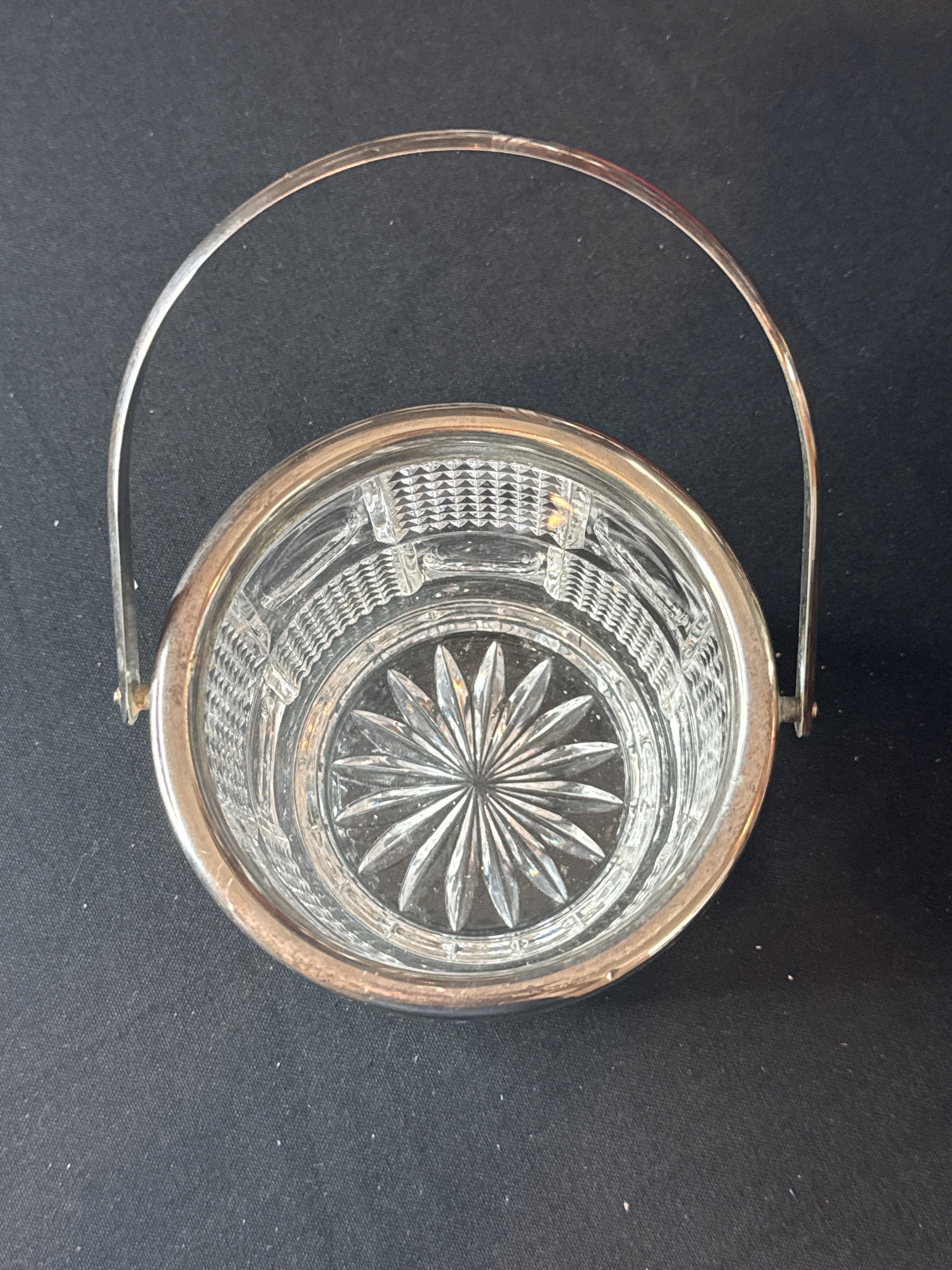 Cut Glass Ice Bucket F B Rogers Silver Co Silver Handle/Trim Germany 5" Tall. Some tarnishing on silver rim and handle. No chips or cracks.