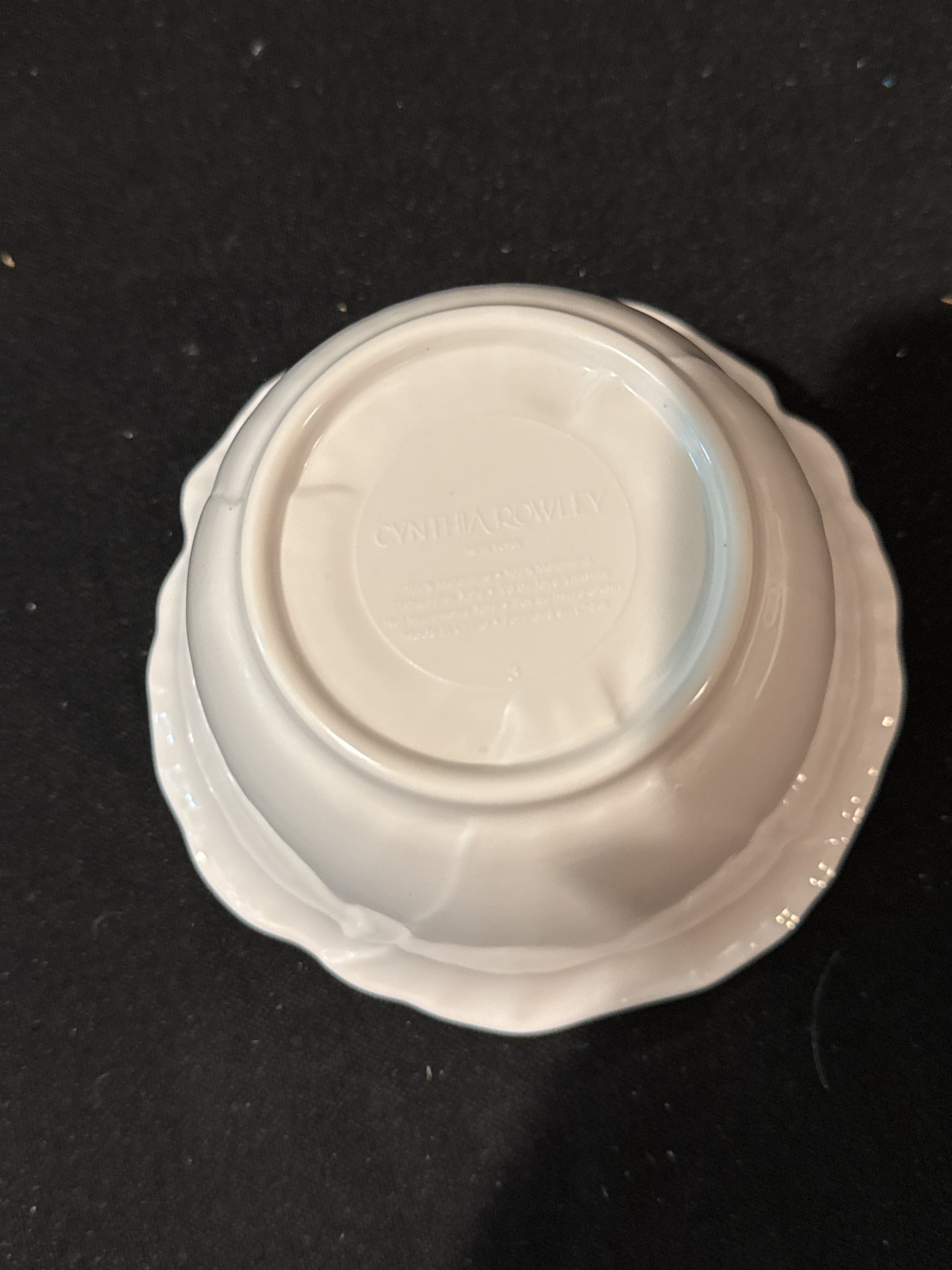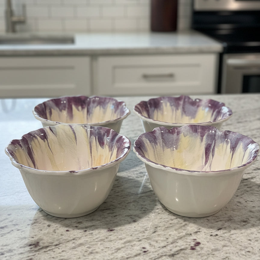 Cynthia Rowley Purple Flower Design Scalloped Edges Melamine Condiment Dip Bowls (4) 2.5" Tall. Set contains 4 New never used. Excellent condition, no chips or cracks. E4