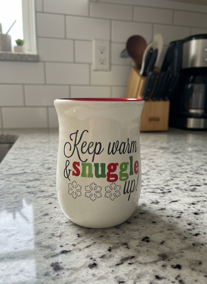 DEI Dennis East Hand Warmer Coffee Mug Cup Snuggle Up Snowflake Right Hand 16oz 5" Tall