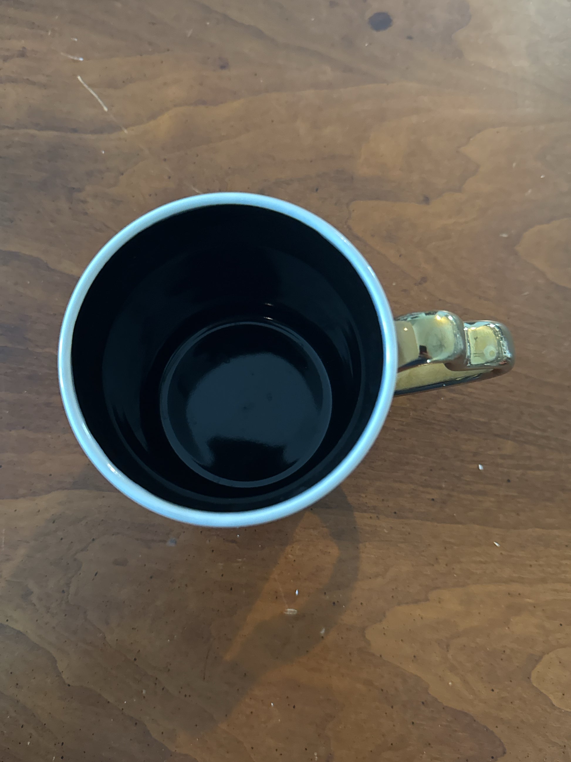 Disney Mickey Mouse Love Heart Hands Coffee Cup Mug Black Interior Gold Heart Handle. 4.25" Tall. New condition, no chips or cracks.