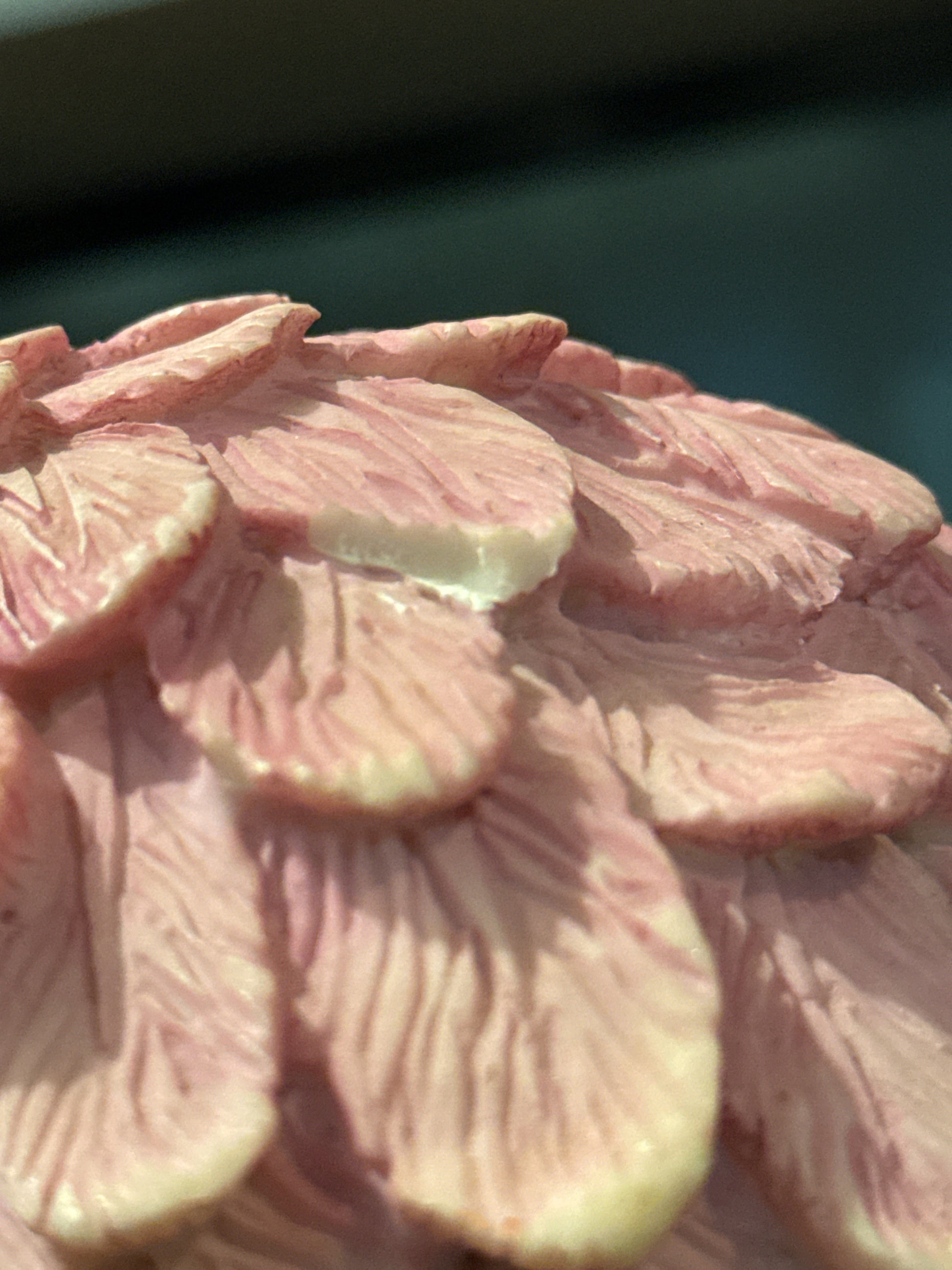 Ebony Treasures Guardian Angel Figurine Resin Pink & Cream 13" Tall x 11.5" Wide. 2 small chips as shown in pictures. Can hardly notice due to beauty and they are both on the back side. Very good used condition.