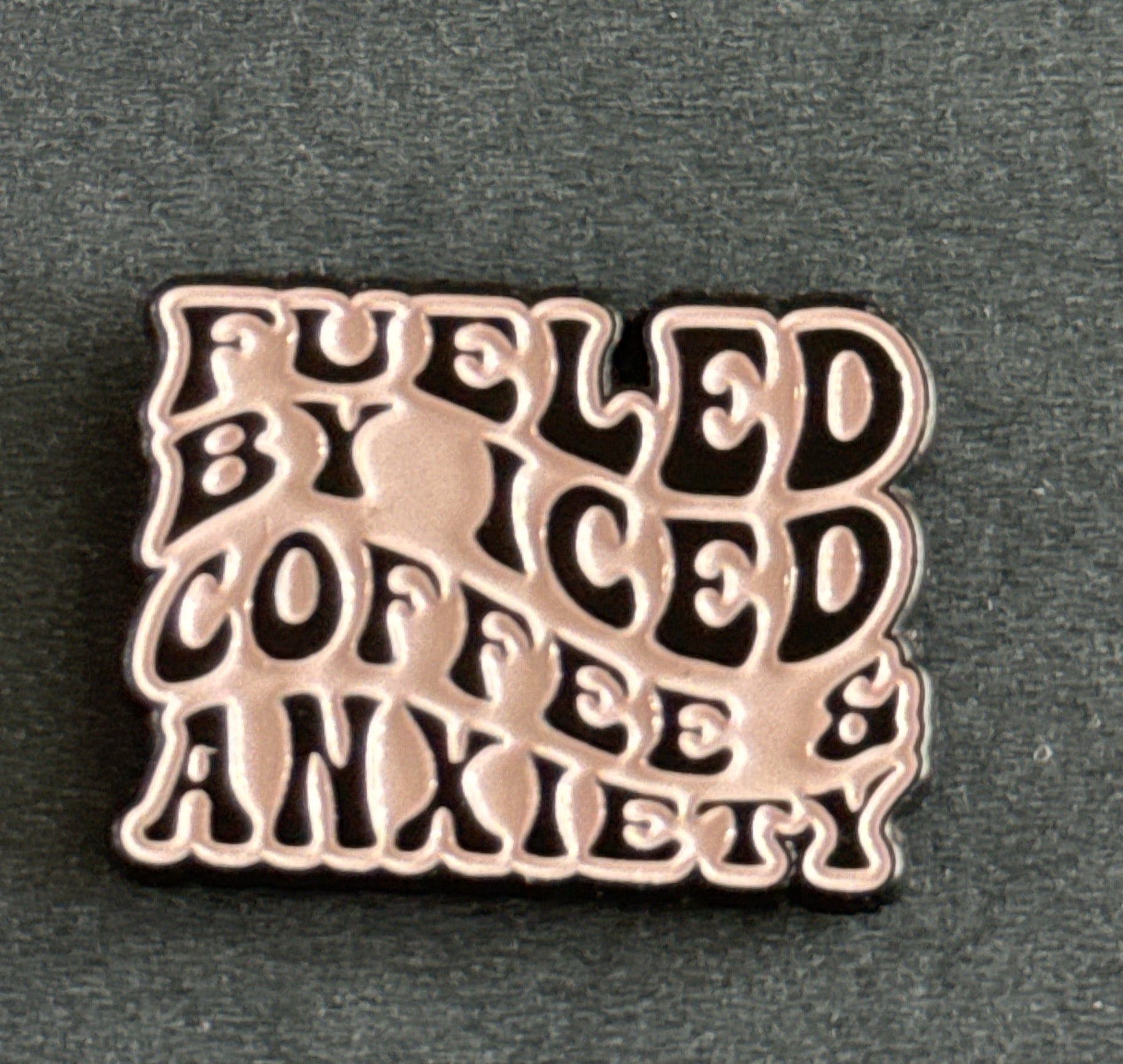 Fueled By Iced Coffee & Anxiety Enamel Pin Black & White