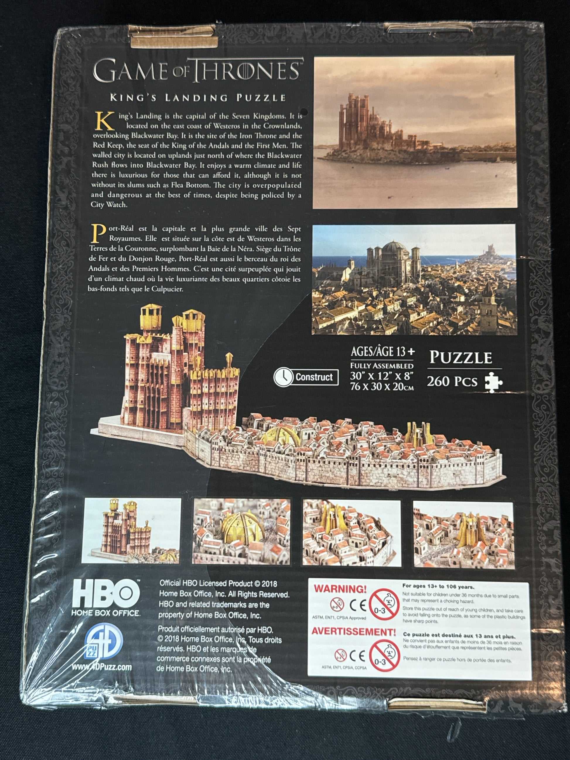 Game of Thrones King's Landing Collector's Puzzle 30" X 12" X 8" 260 Pieces. Brand new in plastic. Some plastic has torn, but box is in unused condition.
