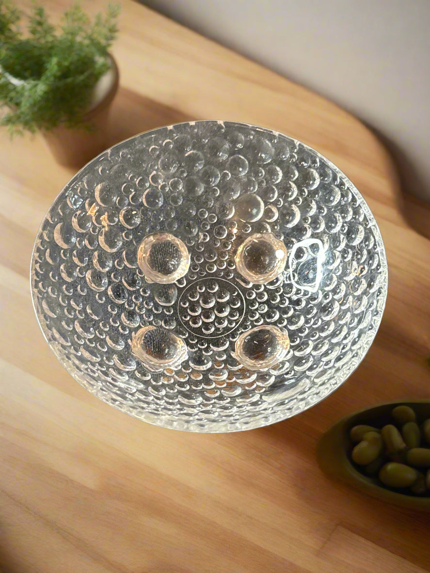 Glass Bubble Dessert/Sauce Bowl 4 3/8" Wide x 1.75" Tall Footed. Excellent condition, no chips or cracks. Currently have 10 in stock.