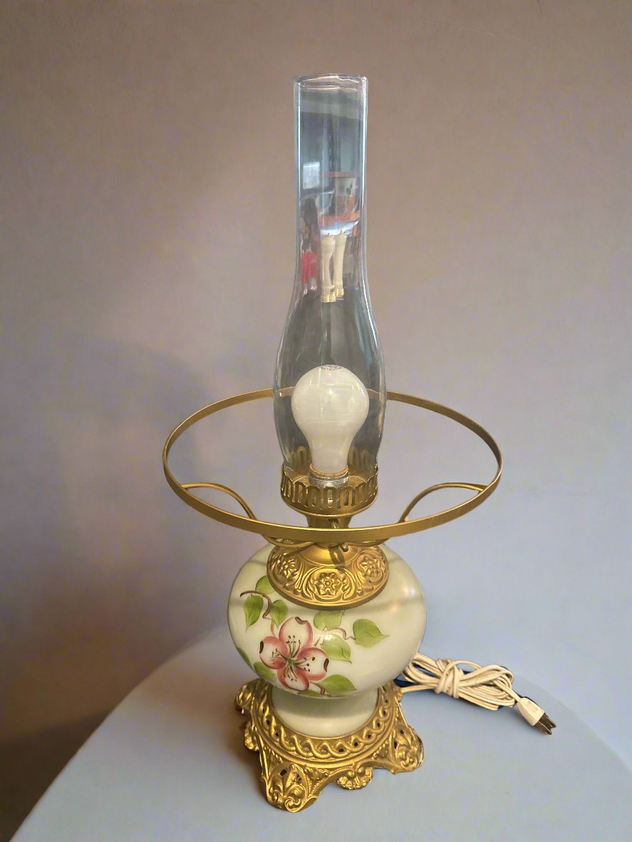 Gone With The Wind Hurricane Lamp Vintage 23" Tall Missing Top Glass Piece. Hand Painted electric lamp with bulb diffuser. Top can be replace with any piece or left alone for that classic style. Works well.
