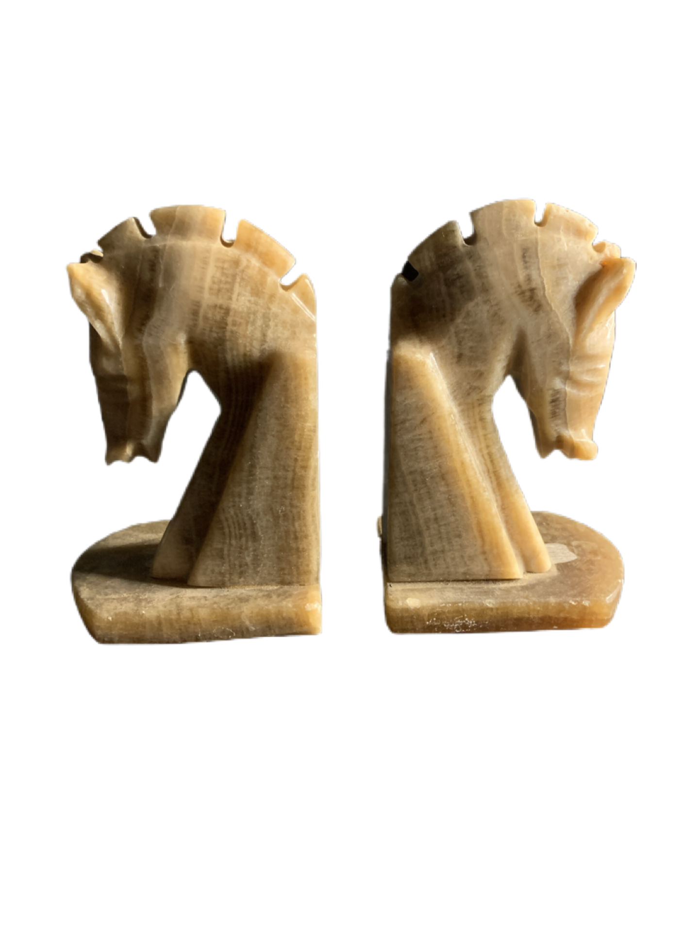 Horse Head Bookends Carved Figure Onyx Natural Stone. This item is preowned and shows signs of cosmetic wear. One has slight scrapes in base as shown in picture. Beautiful pieces. Size is 6.5 inches tall and base is 4 X 2.75 inches. Sold as a pair.