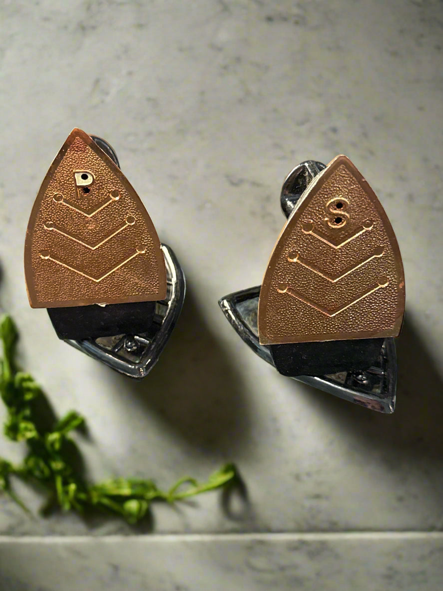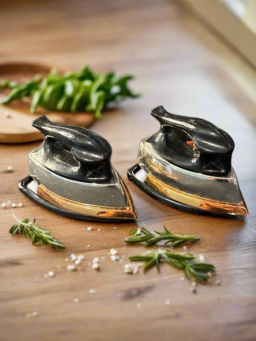 Irons On Stands Salt and Pepper Shakers 3" Tall Clean Never Used Vintage