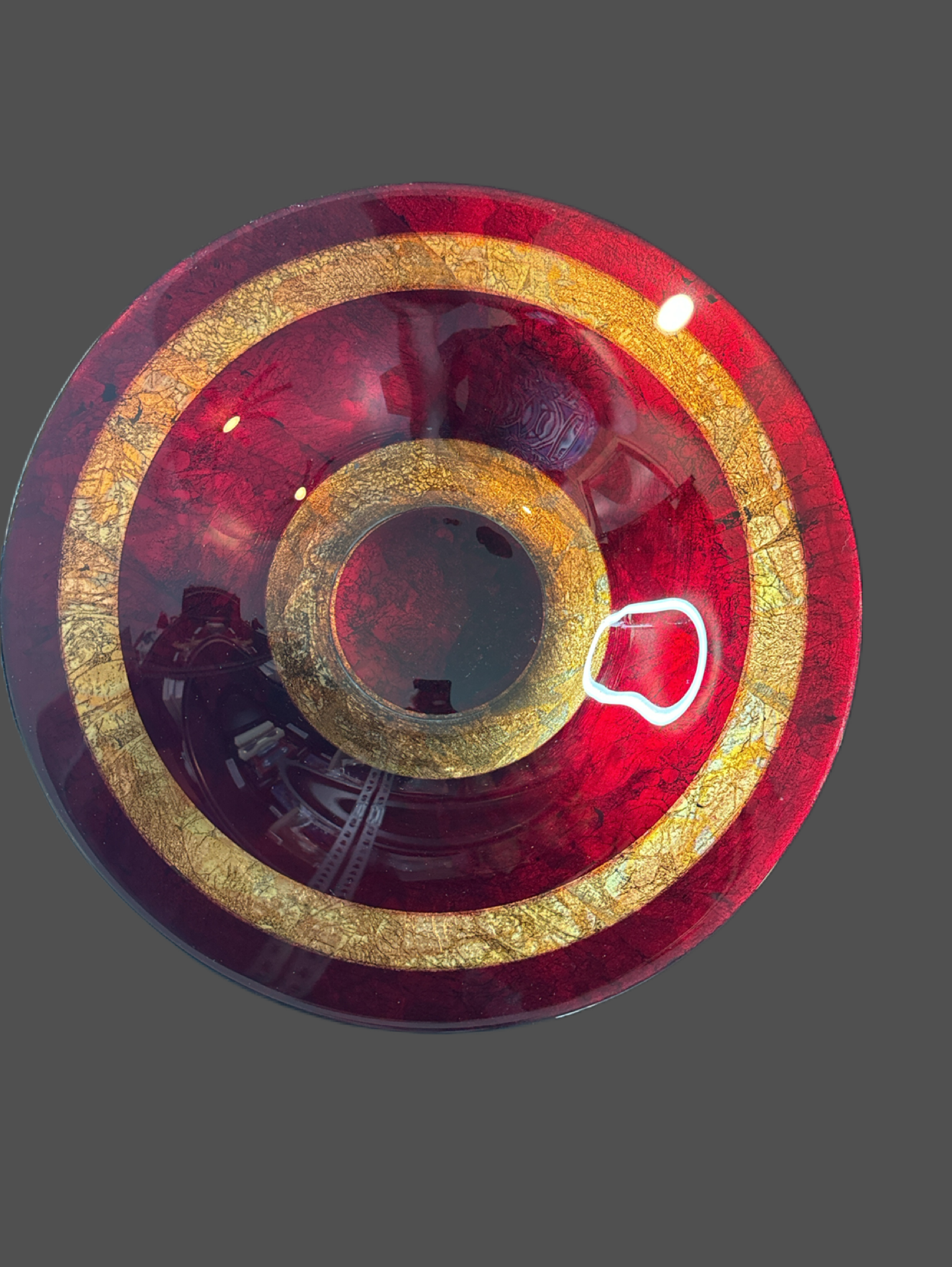 Large Decorative Glass Fruit Bowl - Red and Gold 15.5" Wide and 3.5" Tall