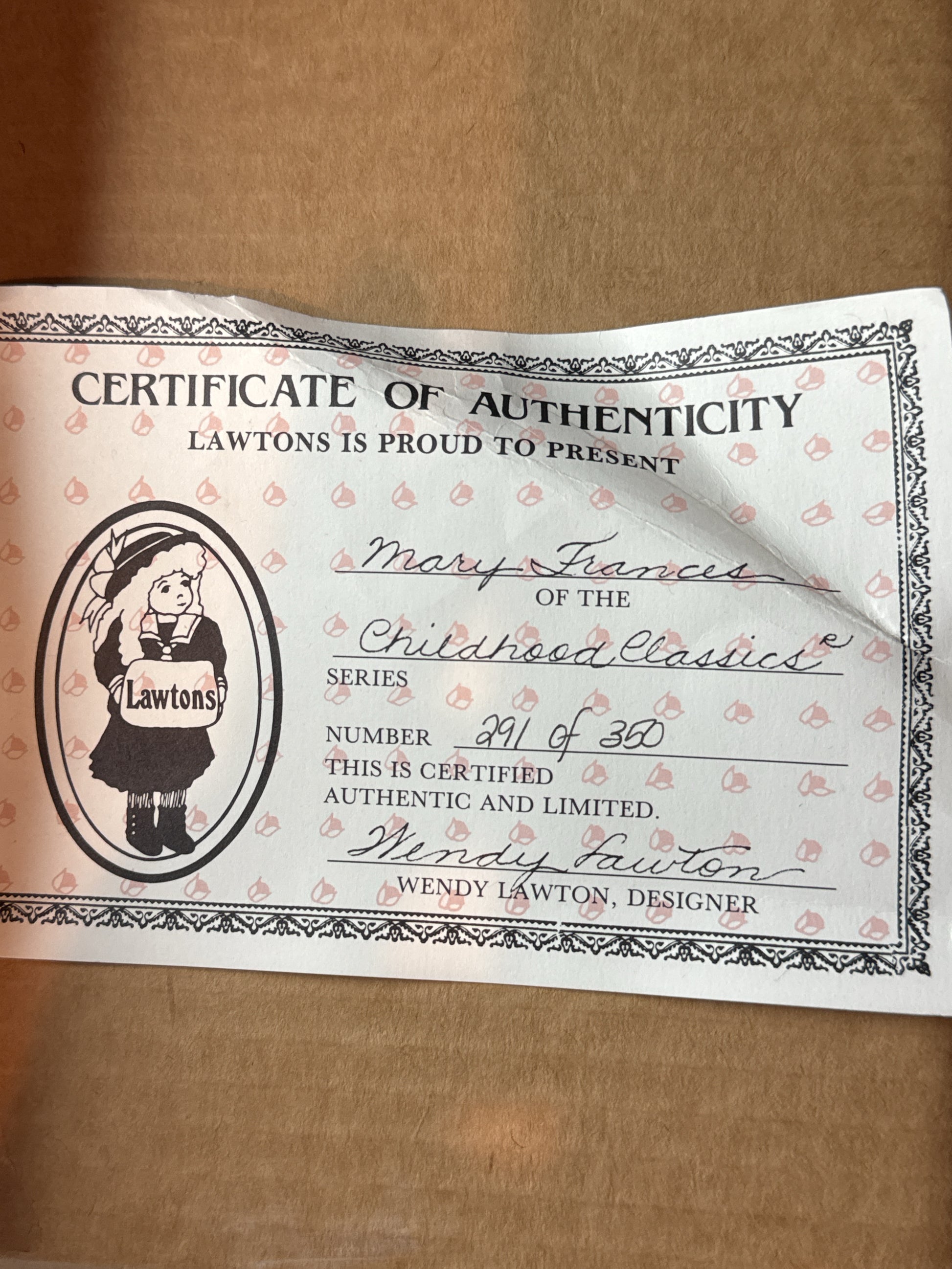 Lawtons Childhood Classics Doll Mary Frances #291/350 with COA New in Box