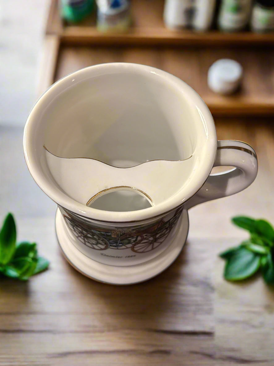 Lefton Vintage Mustache Saver Coffee Cup Antique Automobile 1886 Daimler Japan 4" Tall. Excellent condition, no signs of use. No chips or cracks.