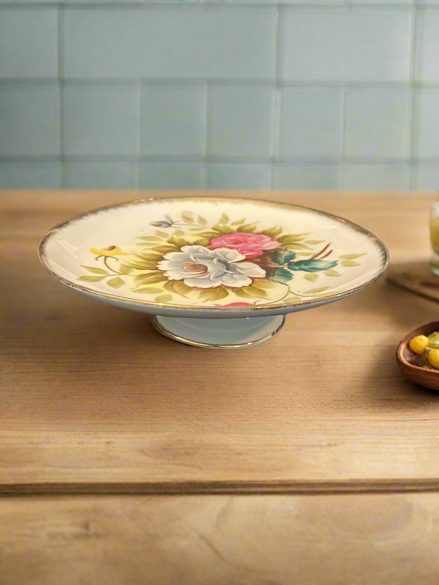 Lenwile Ardalt Cake Stand 2.5" Tall Floral White and Pink Roses Gold Trim 10" Wide. Very good condition for age. No chips or cracks.