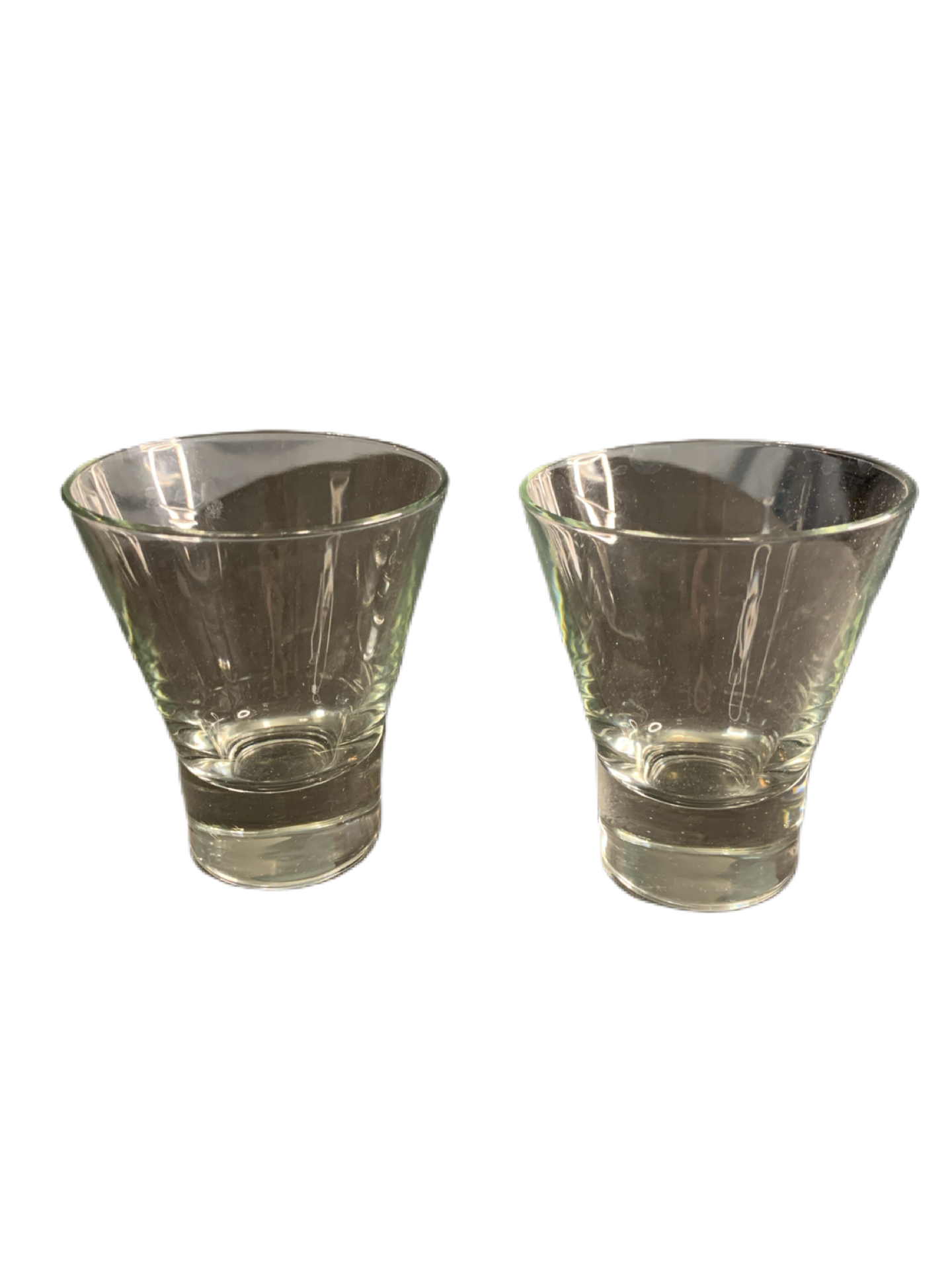 Martini/Cocktail Clear Stemless 10 oz Glasses w/ Heavy, Weighted Bottoms - Set of 2. Simple Stylish and contemporary crystal clear, thick walled Martini or Cocktail glasses. Heavy, weighted 2 inch base reduces accidental spills! Pristine/Mint condition in every manner. With no chips, cracks, scratches, stains, water marks or any other cosmetic issues. Measures: 4 1/8" tall, 3.5" wide at rim.
