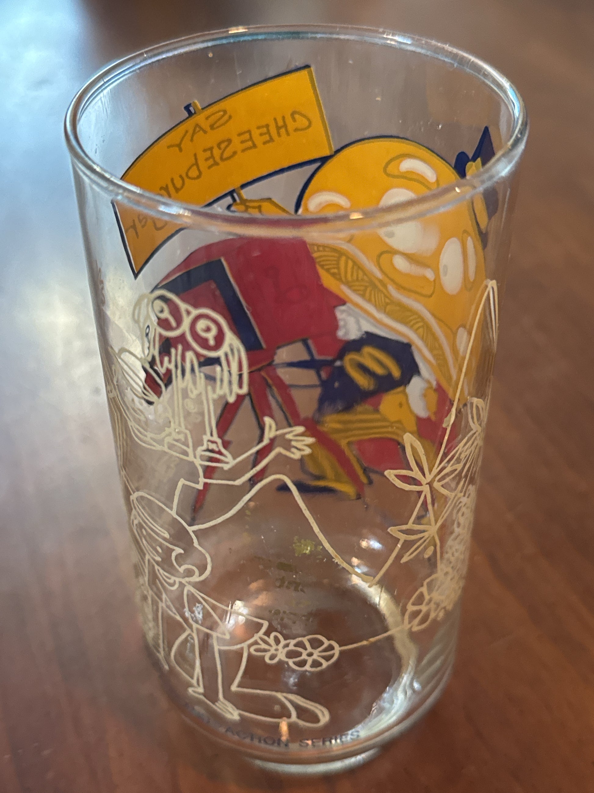 McDonalds 1977 McDonaldland Action Series Drinking Glass Mayor McCheese 5.5" Tall. Excellent condition, vibrant colors, no chips or cracks.