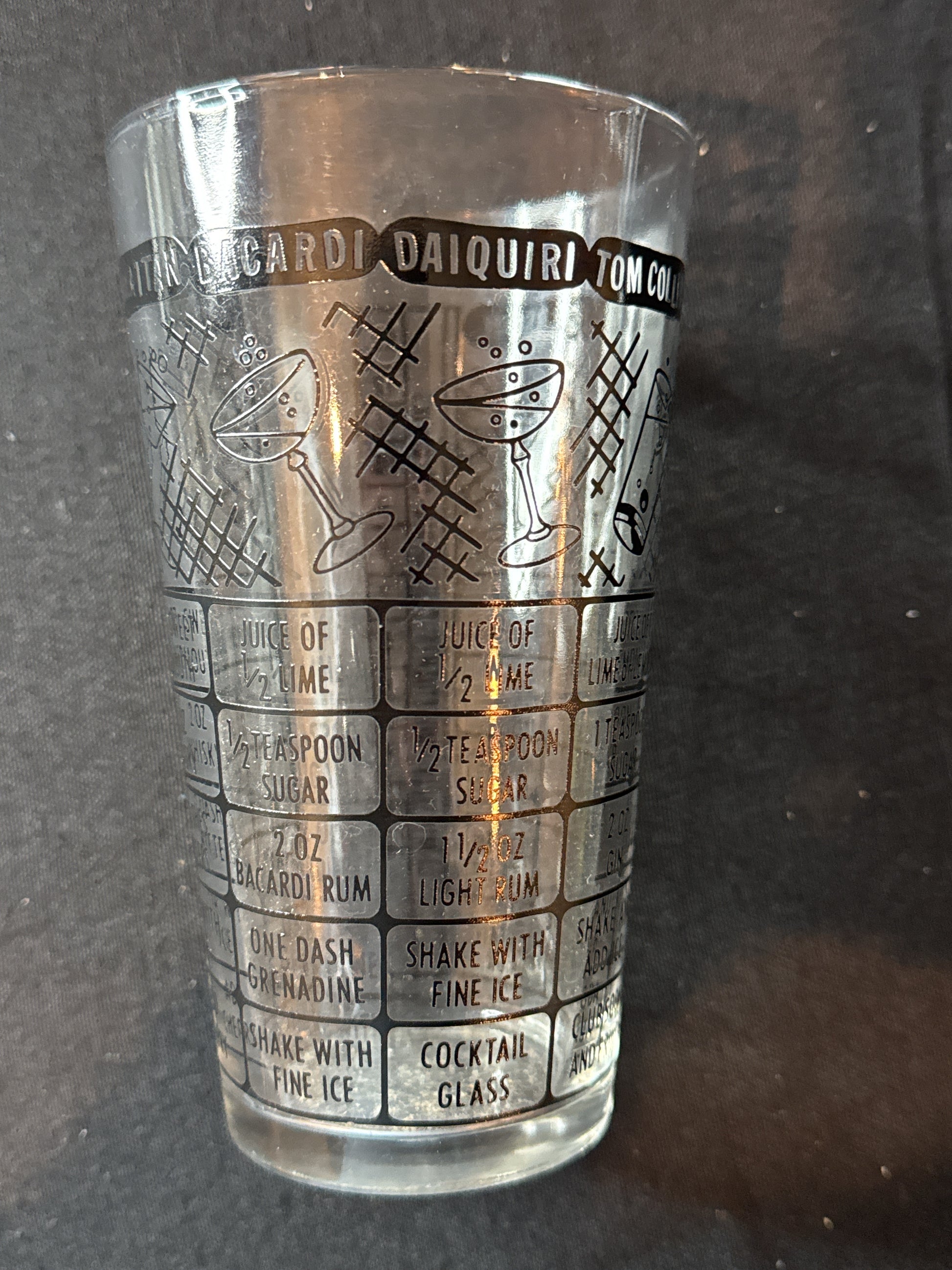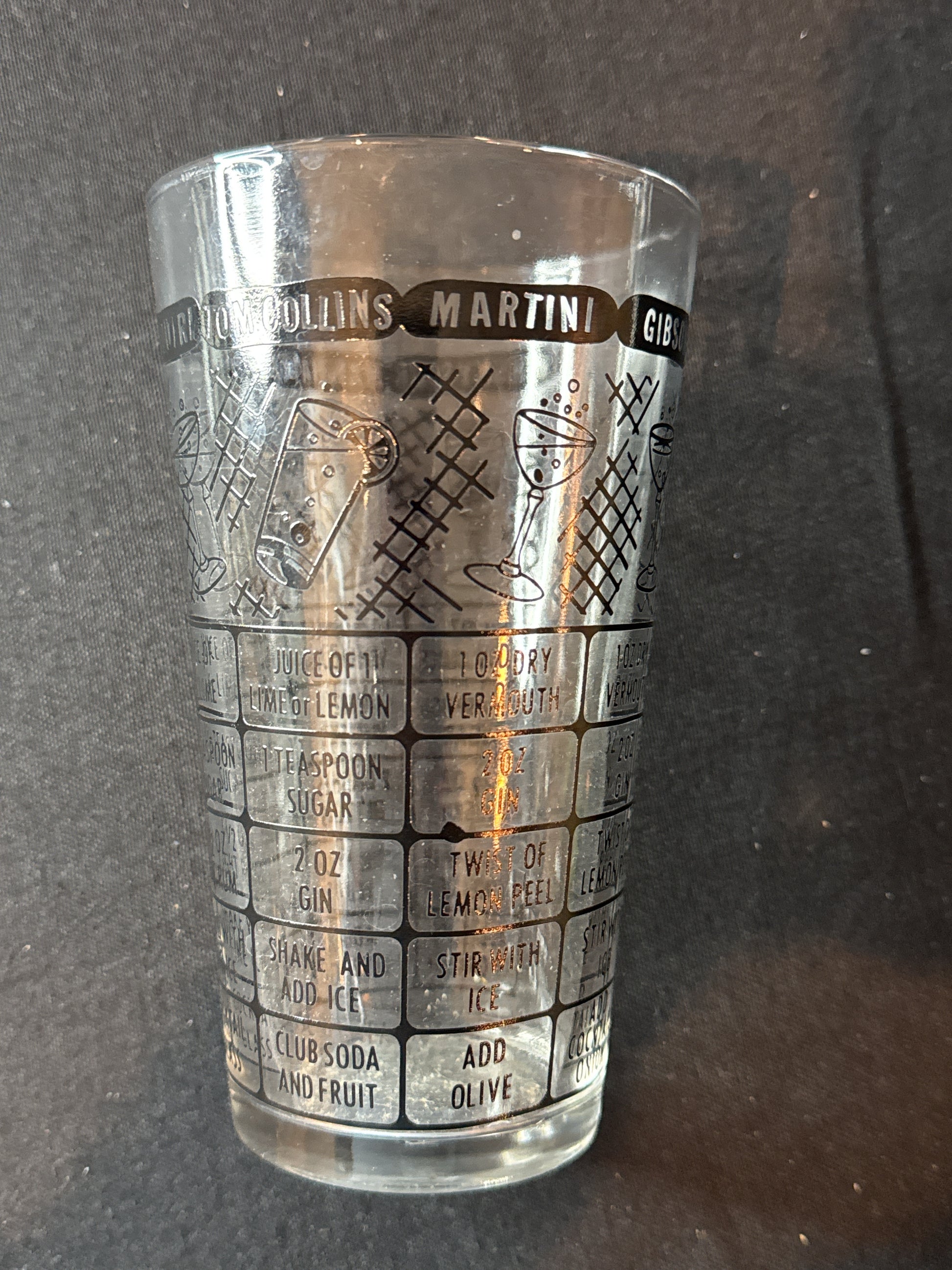 Mid Century Modern Federal Glass Cocktail Mixer Glass Black Printing 6" x 3.5". Excellent condition, no chips or cracks.