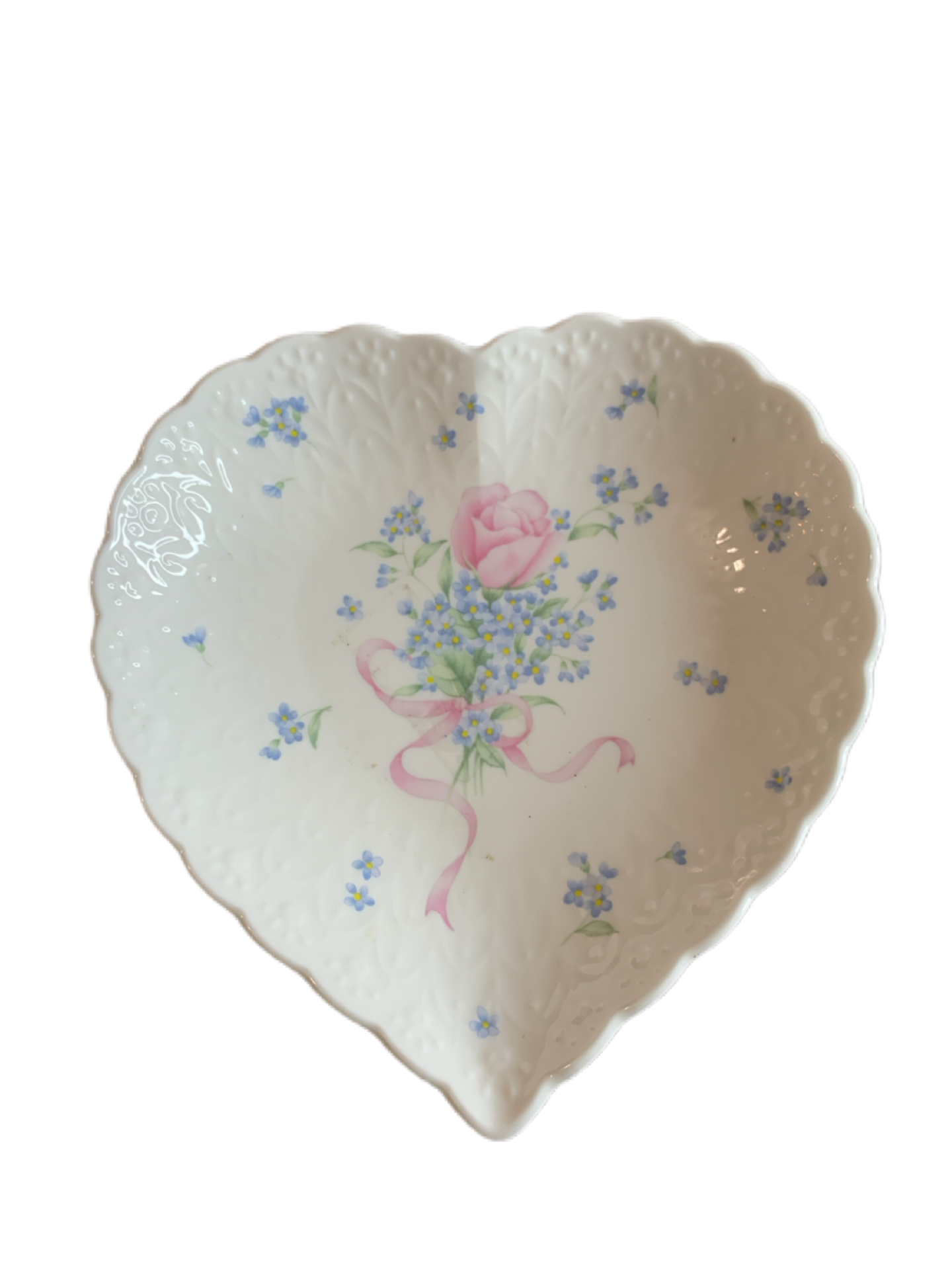 Mikasa 6" Japan Heart Shaped "Always and Forever" Embossed Porcelain Dish Pink Rose. Measures 6.25" Wide, 6.5" long and 1 3/8" tall. Lovely pastel roses and Forget Me Nots with an embossed and scalloped edge. No cracks or chips. Excellent condition.