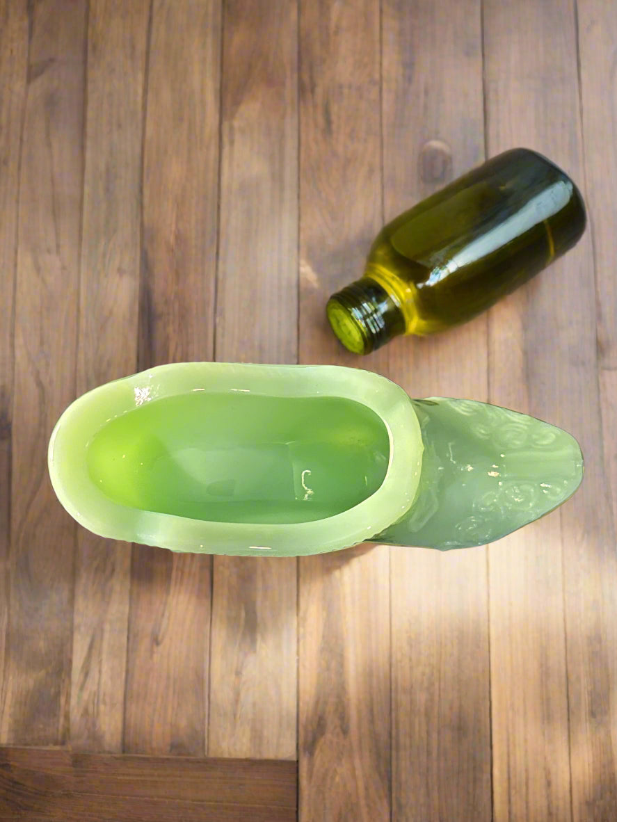 Mosser Jadeite Green Glass Slipper Cambridge Ohio Painter Signed on Heel 4.5" Long
