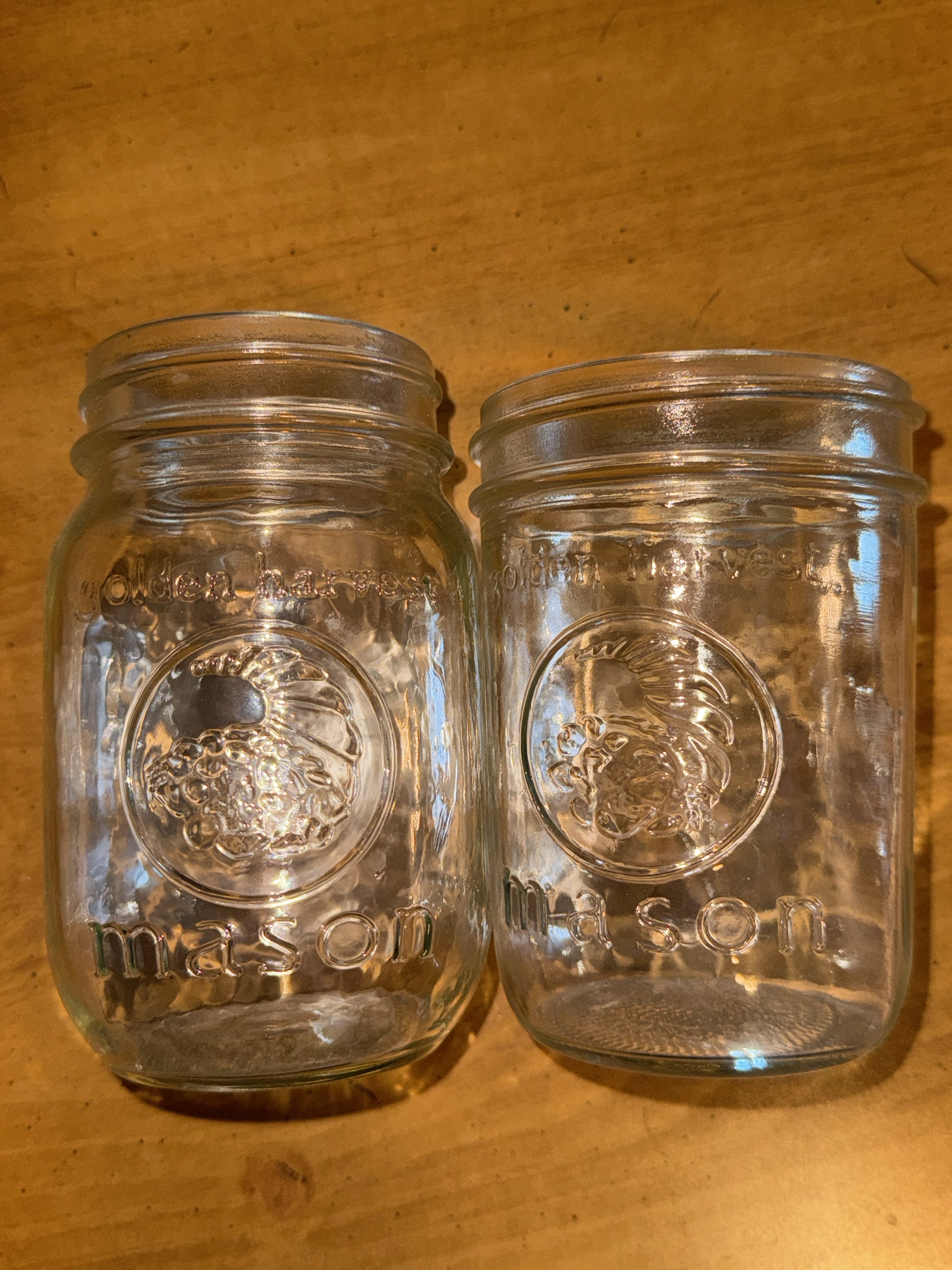 Pair of Different Golden Harvest Mason Jars Clear With No Lids 4.75" Tall and 5.25" Tall