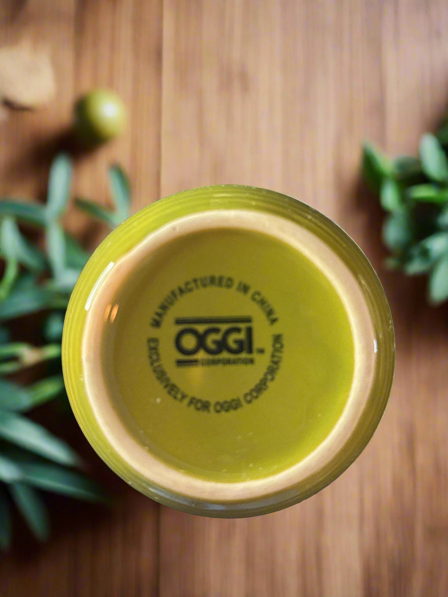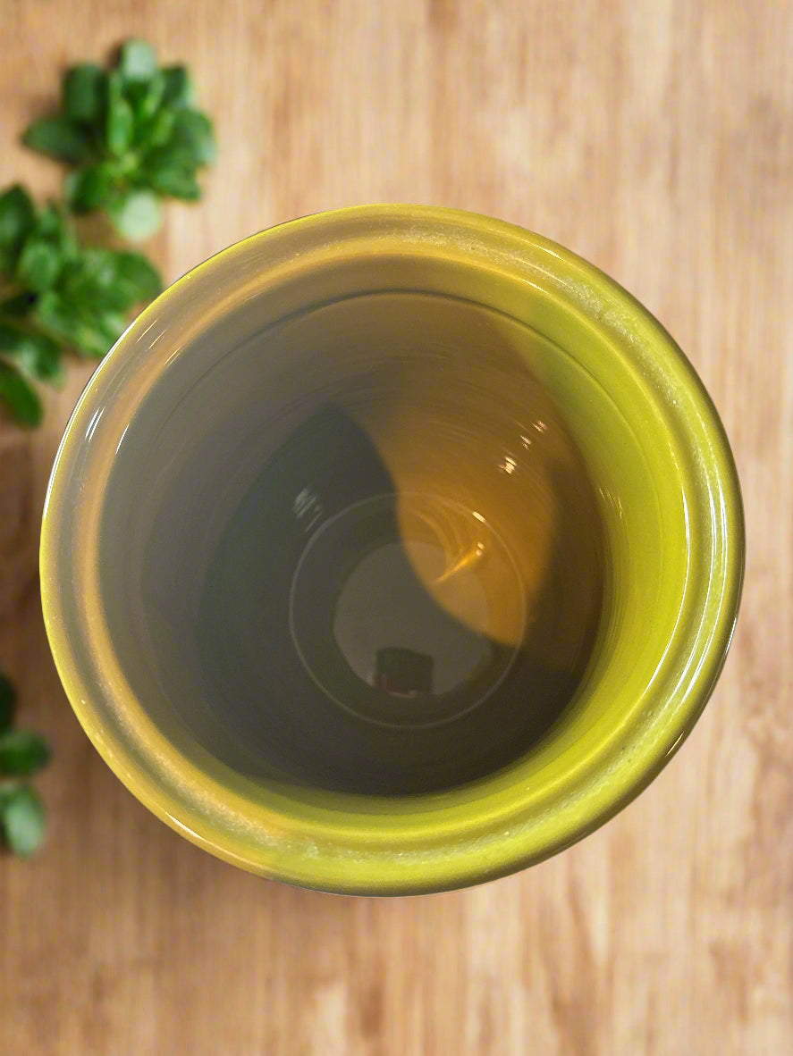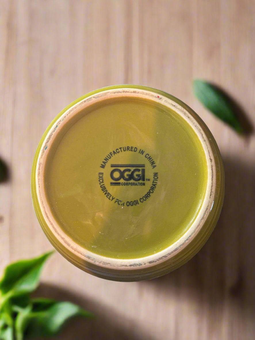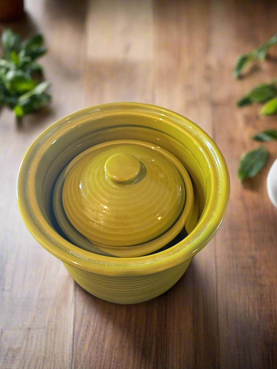 Pair of Nesting Green Ceramic Ribbed Canisters from OGGI 9" & 7" Tall. One fits inside the other for storage. Very clean, excellent condition, no chips or cracks.