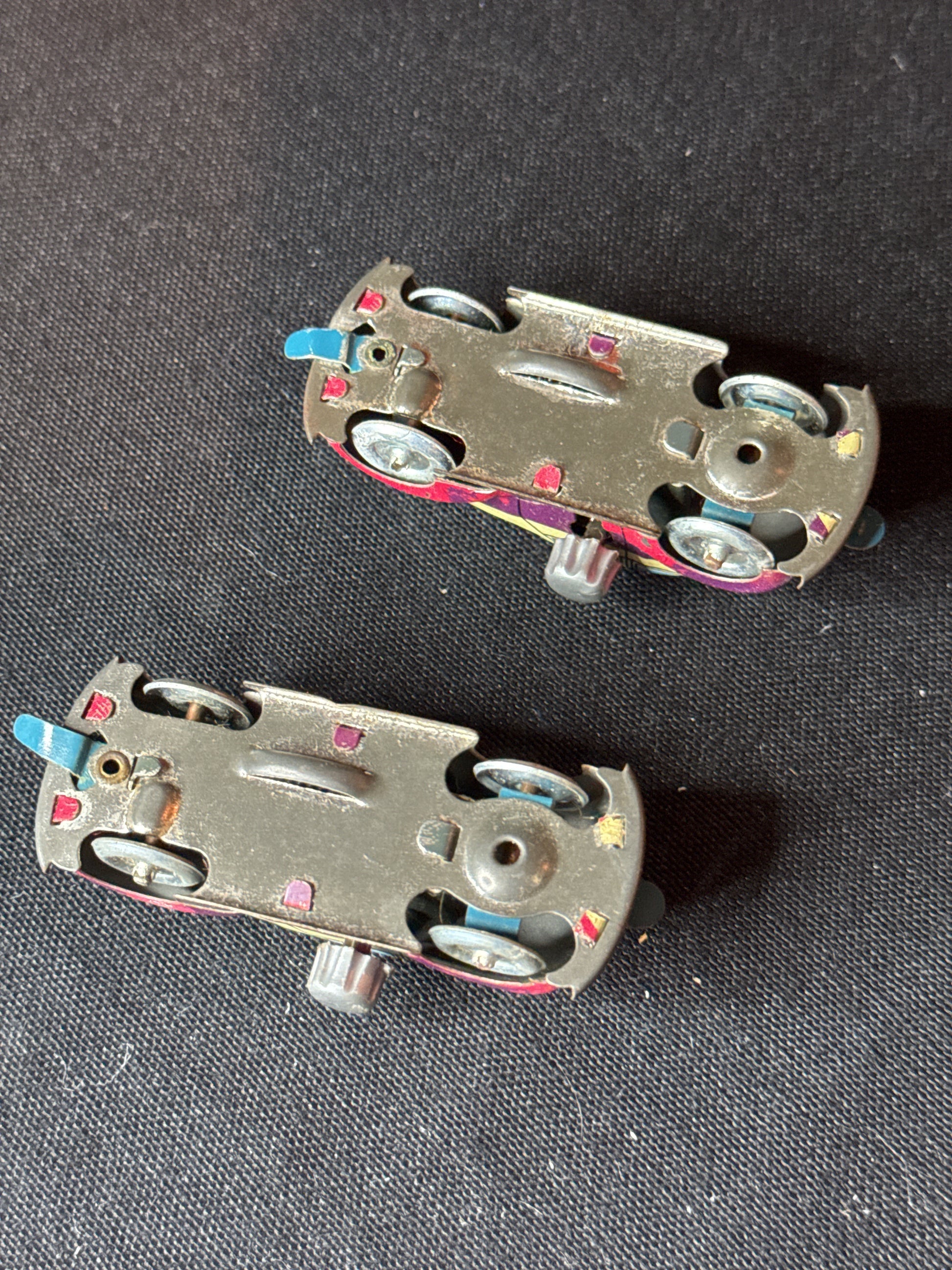 Pair of Vintage Wind Up Toy Car Tin Litho Made in Japan 2.5" Both Work. Wind them up and release the brake and watch them go for yards.