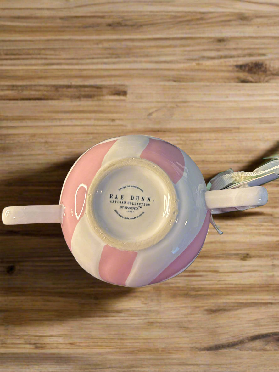 Rae Dunn Artisan Collection Double Handled Coffee Mug Cup "Jolly" Pink/White 3.5" Tall New with tags. Excellent condition, no chips or cracks.
