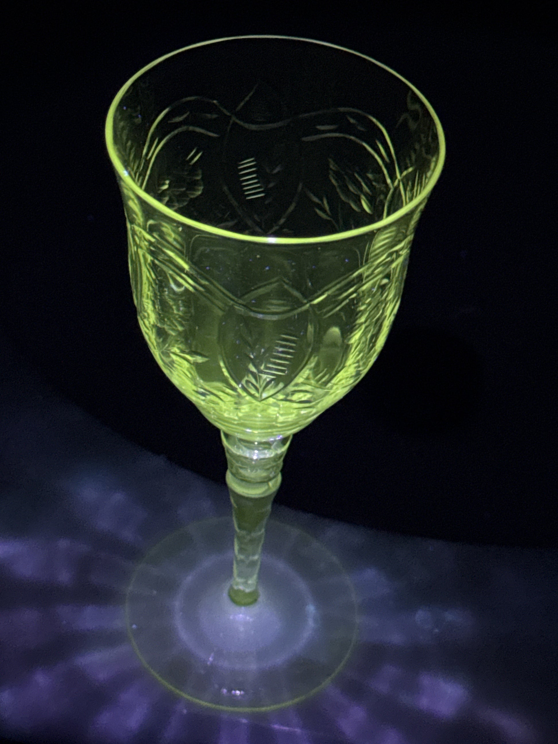 Rock Sharpe 2009-9 Pattern Water Goblet Glass 7 5/8" Tall Glows under 365 Flashlight. Excellent condition. Glows Green. No chips or cracks. Currently have 4 in stock.