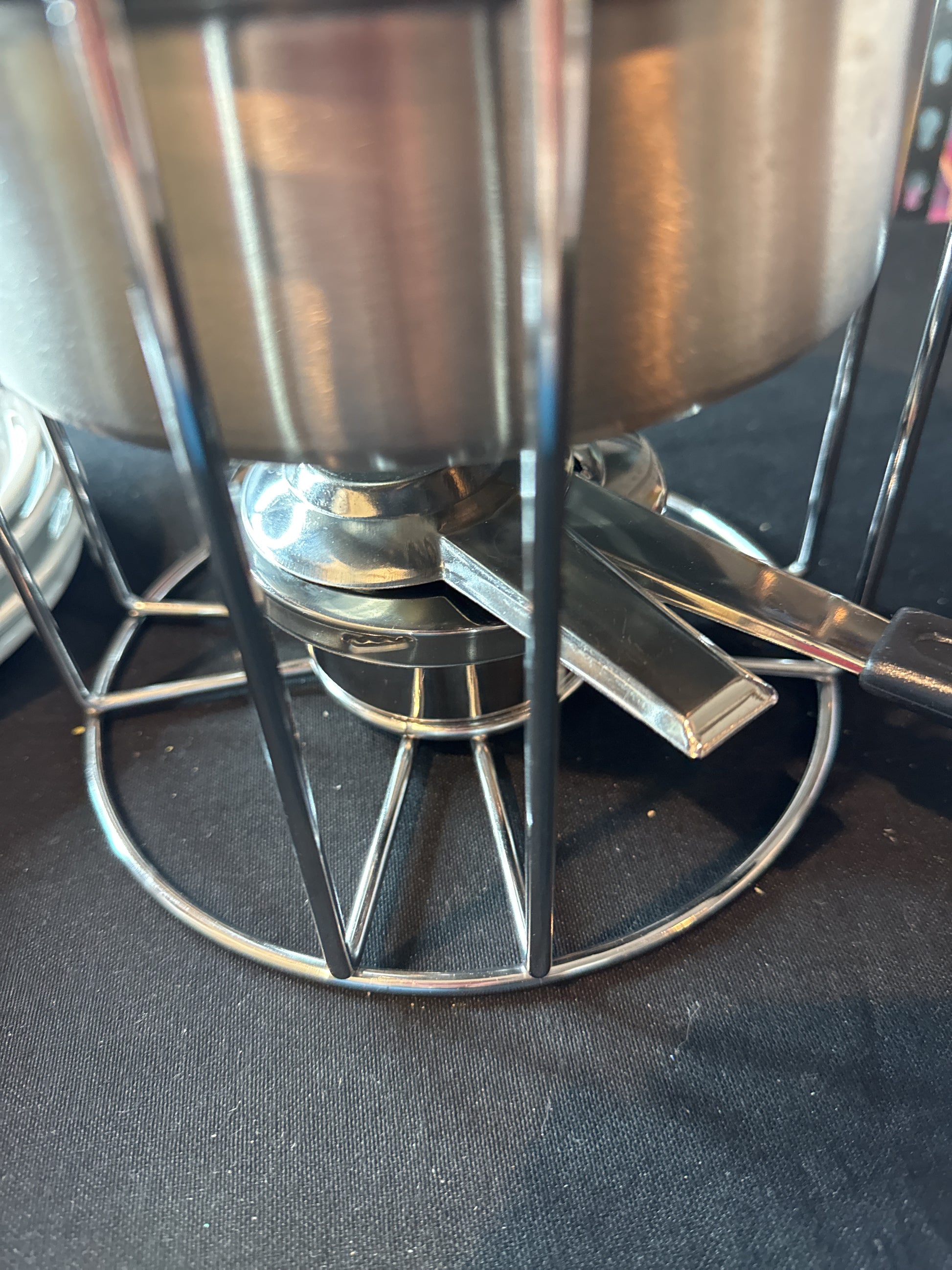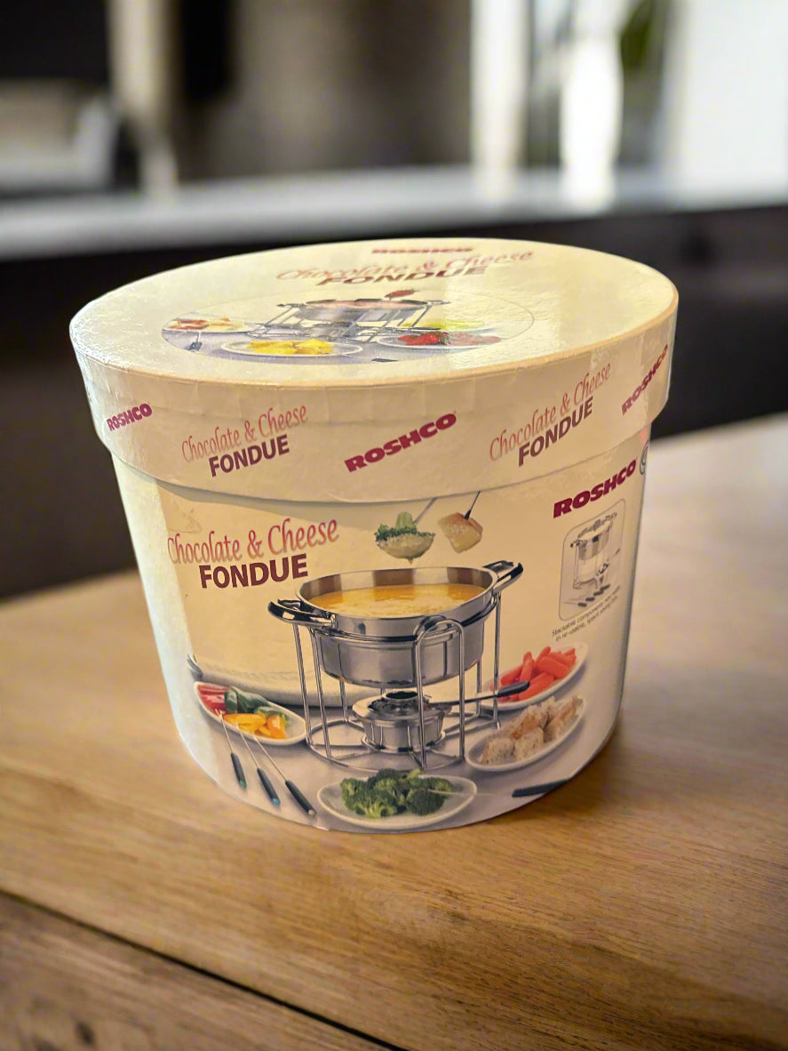 Roshco Chocolate & Cheese Fondue 10 Piece Set Stainless Steel. Good used condition, some wear in pot, but ultimately clean and useable. Only 2 fondue forks and 4 plates.