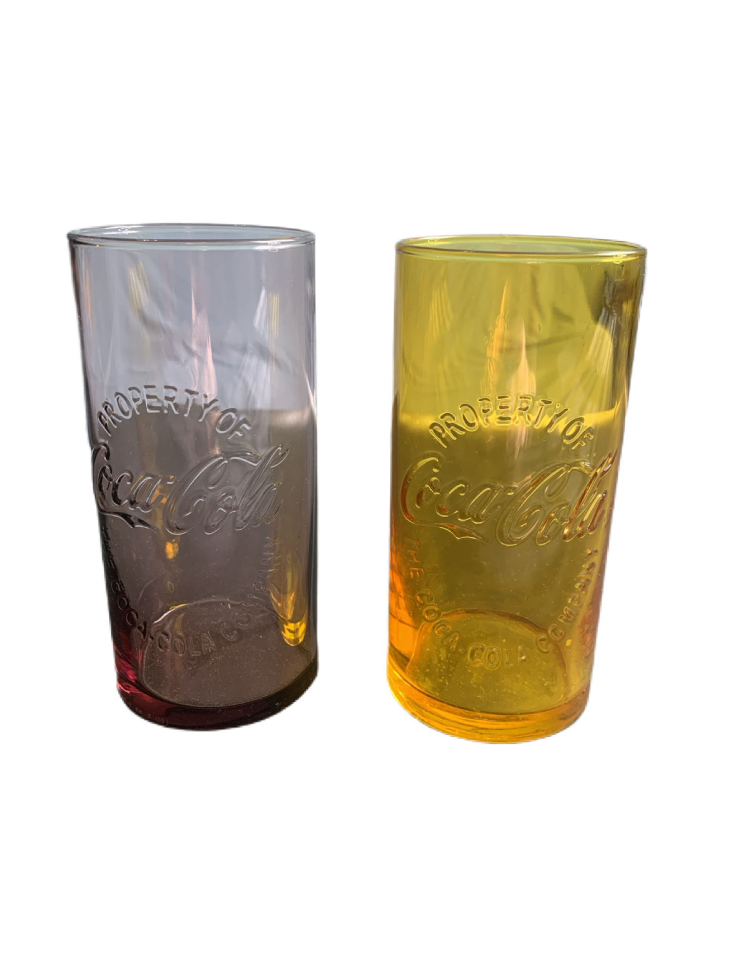 Set of 2 Coca Cola Glasses Purple and Orange 10 ounces. 2 unique colors and shapes of Coca Cola glasses. Excellent condition. Stands 5.5" tall and 2.5" wide at top. Perfect for that Coke enthusiast.