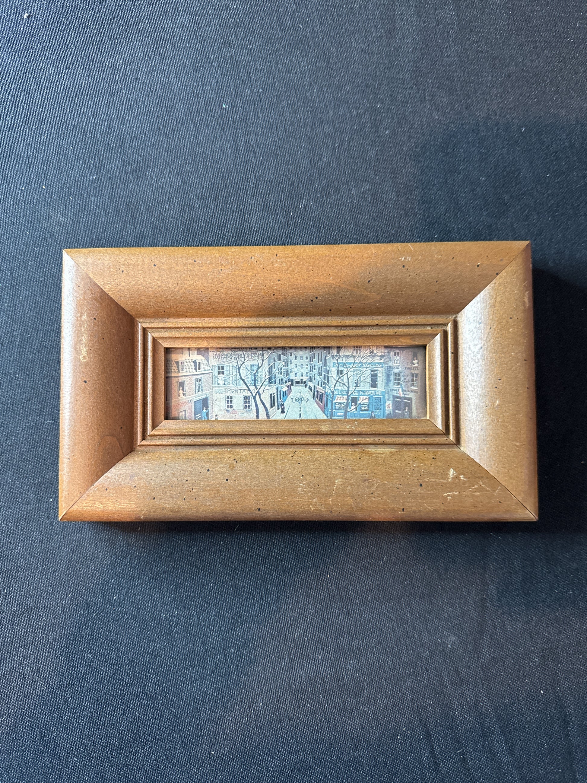 Small Wooden Frame With Picture of A Street & Buildings 7.5" Wide x 4.25" Tall Hanging Only. Used condition. Home decor