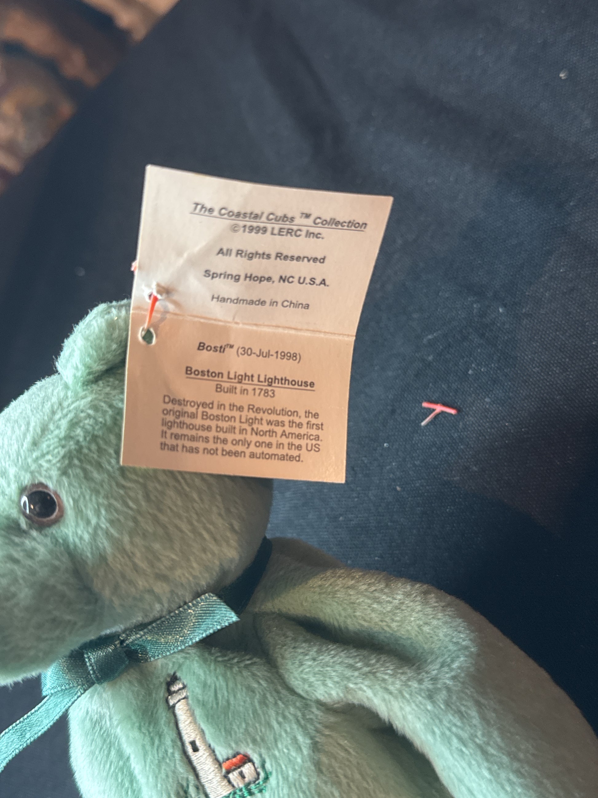 The Coastal Cubs BOSTI Lighthouse Bear Beanie Plush Boston Light LERC Green 8" Tall. Excellent used condition. Not used by children.