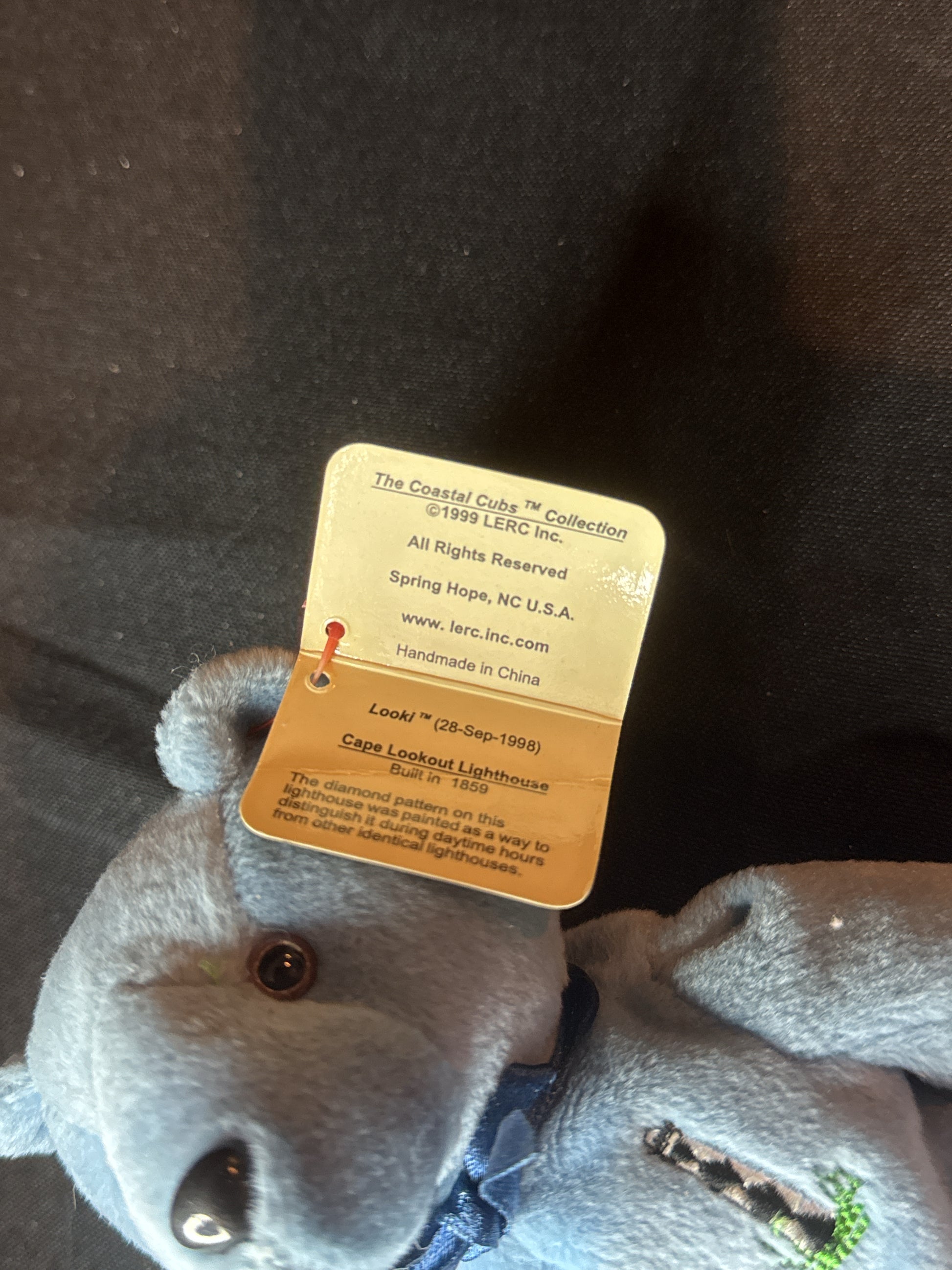 The Coastal Cubs LOOKI Lighthouse Bear Beanie Plush Cape Lookout LERC Blue 8" Tall. Excellent used condition, not used by children.