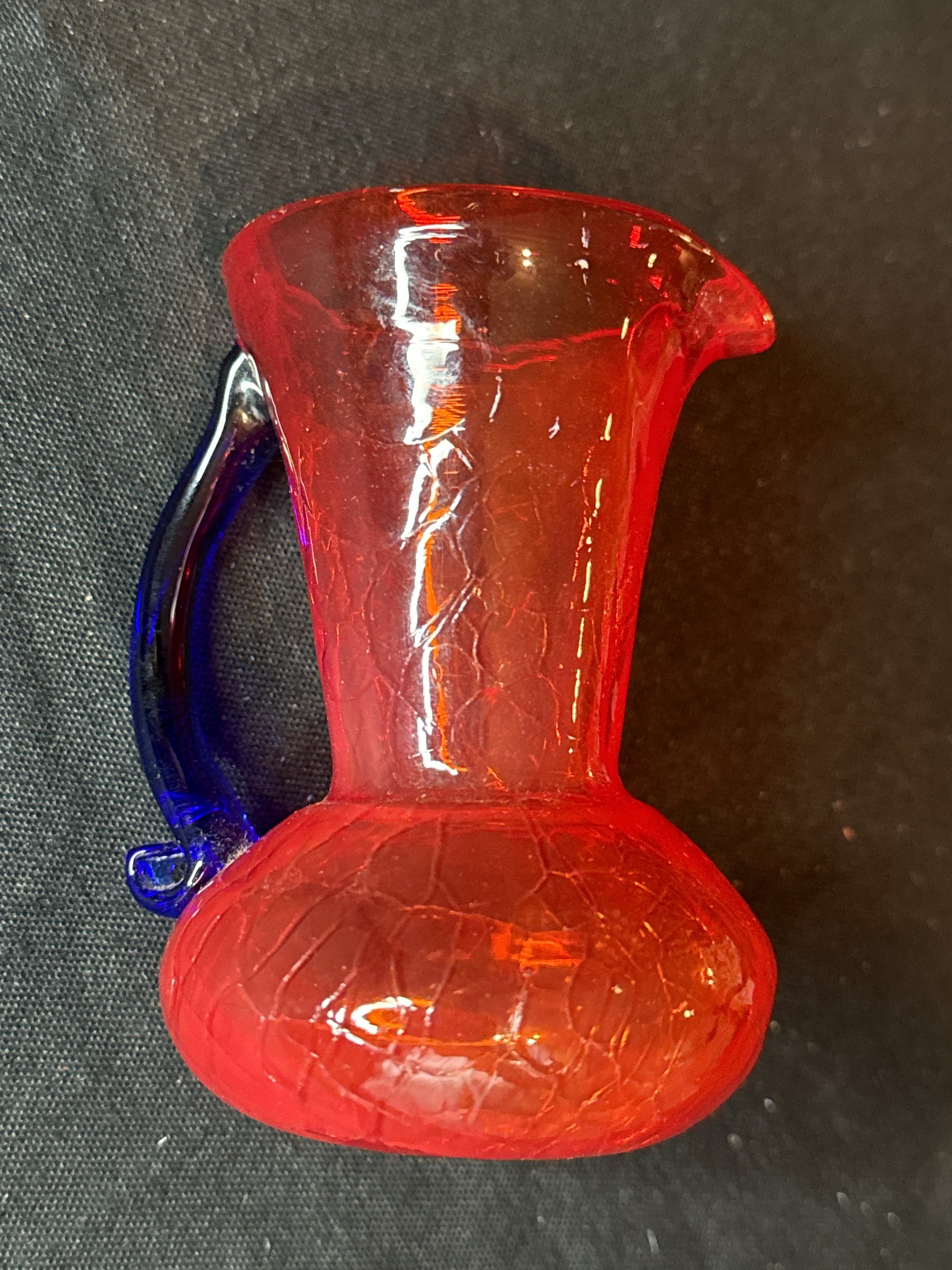 Vintage 4" Blenko Crackle Glass Creamer Pitcher Flame Orange Persimmon Blue Handle MCM. Hand blown glass Excellent condition, no chips or cracks