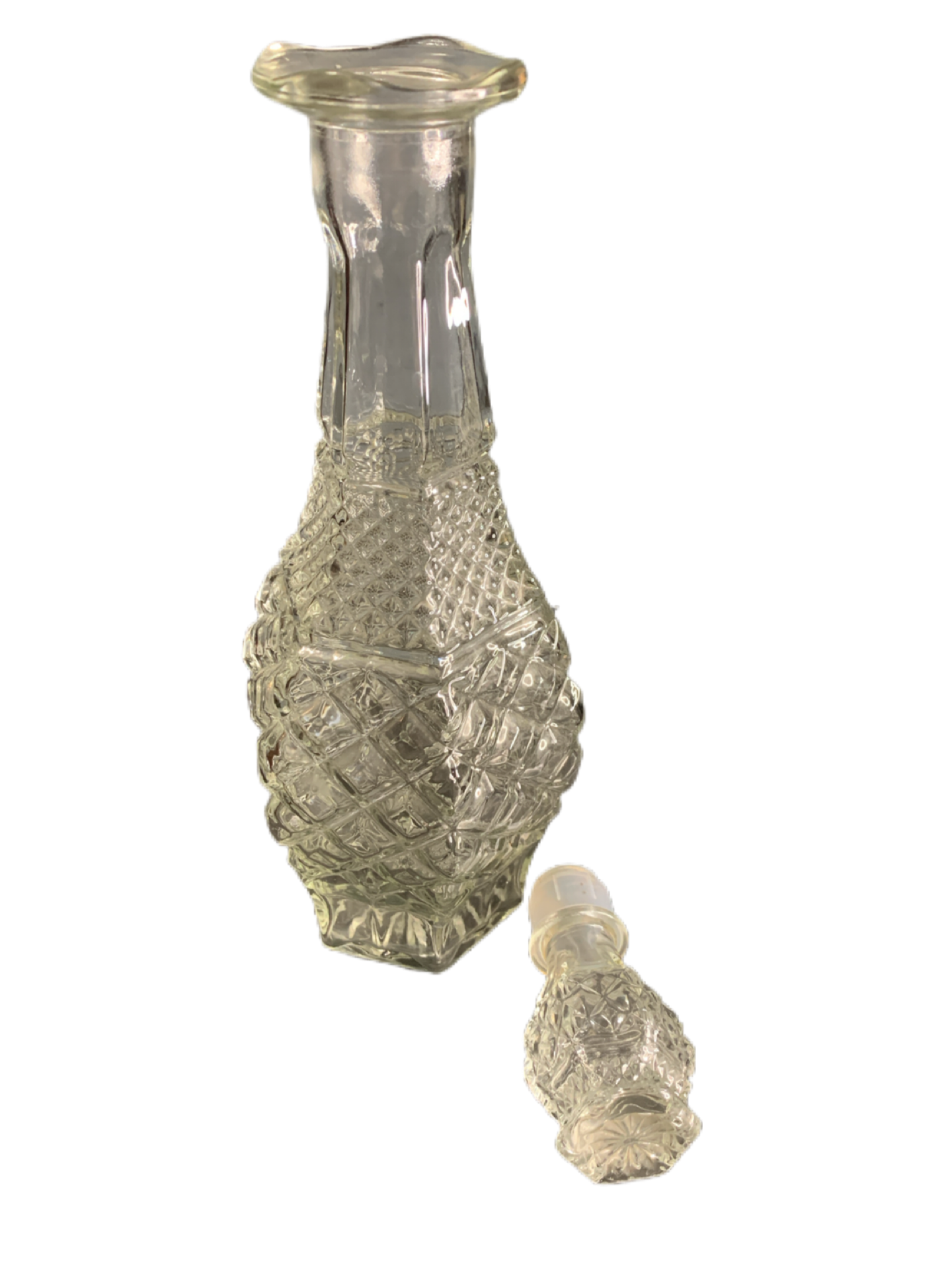 Vintage Anchor Hocking Wexford Glass Decanter with Stopper 32 Oz with 5 Water Glasses. Pineapple Diamond design. Clear Diamond Point Wexford Decanter with matching stopper. The Decanter is in excellent condition with no chips or cracks. The Decanter measures 14 1/2" tall and 3 1/4" wide at base. The decanter comes with the original stopper and the stopper is in great condition and shows very little use. The water glasses are of the same Diamond Wexford design. 5 3/8" tall Cordial Goblet Footed Water or Juice glass. Decanter and 5 glasses come as a set. Will not sell individually.