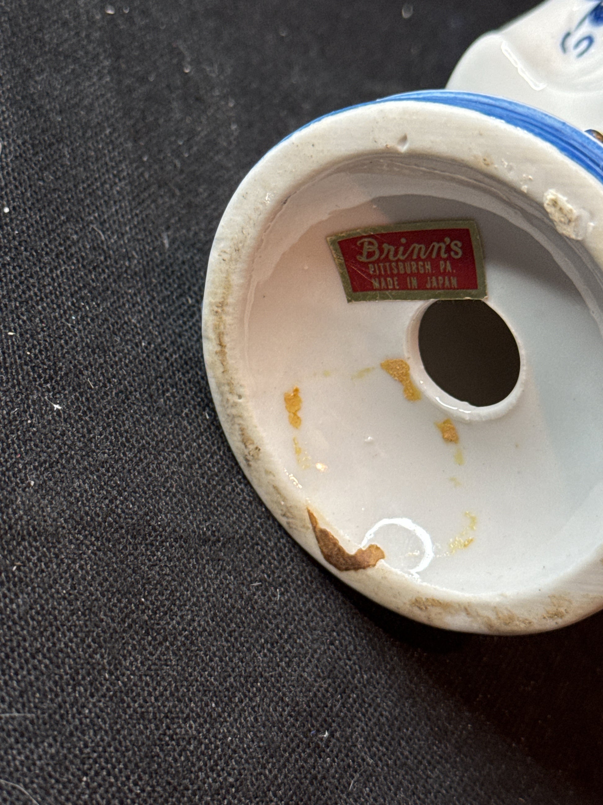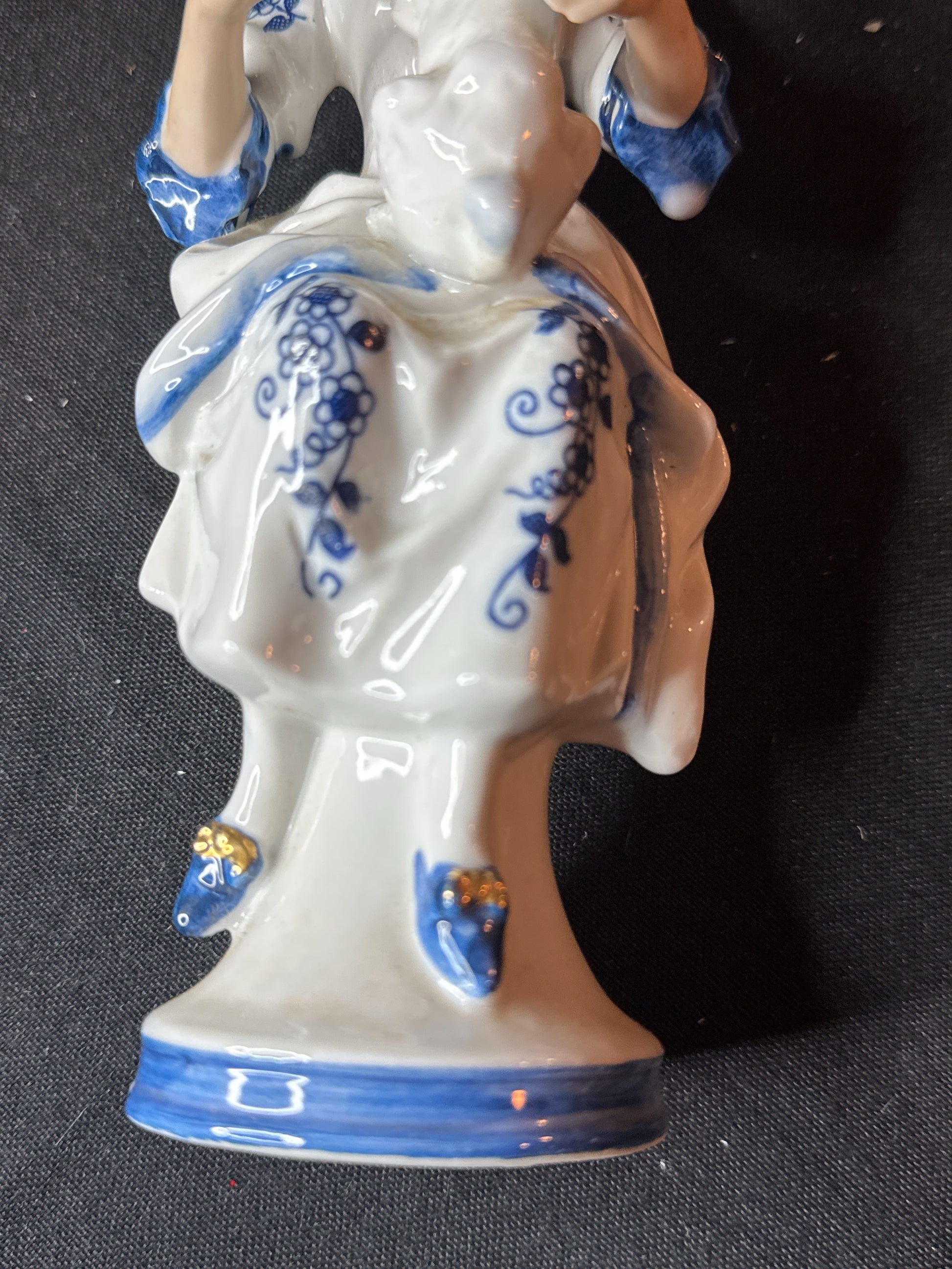 Vintage Brinn's Pittsburgh, PA Blue and White Porcelain Lady & Dog Figurine 8" Tall. Made in Japan. Excellent condition, no chips or cracks.