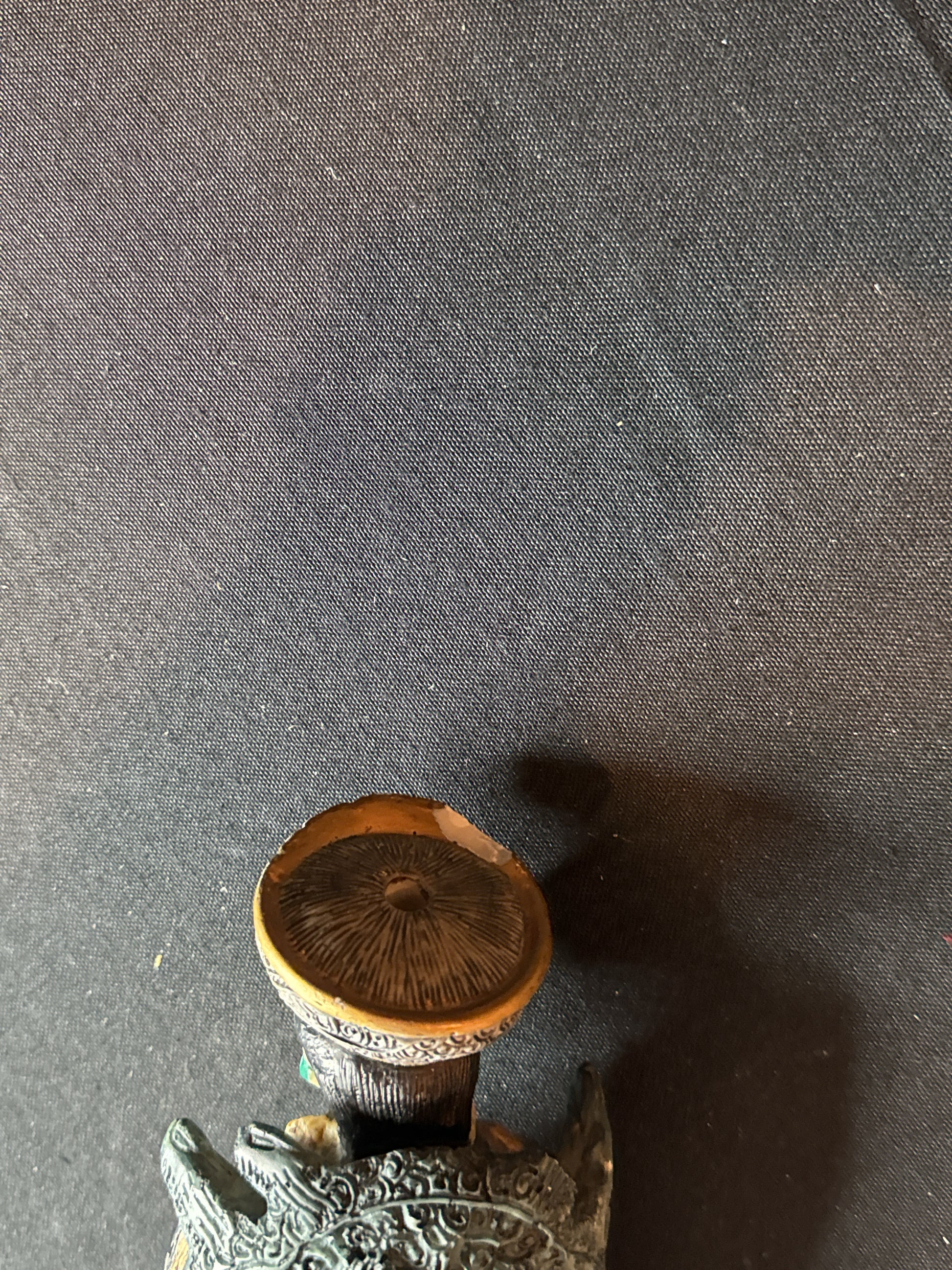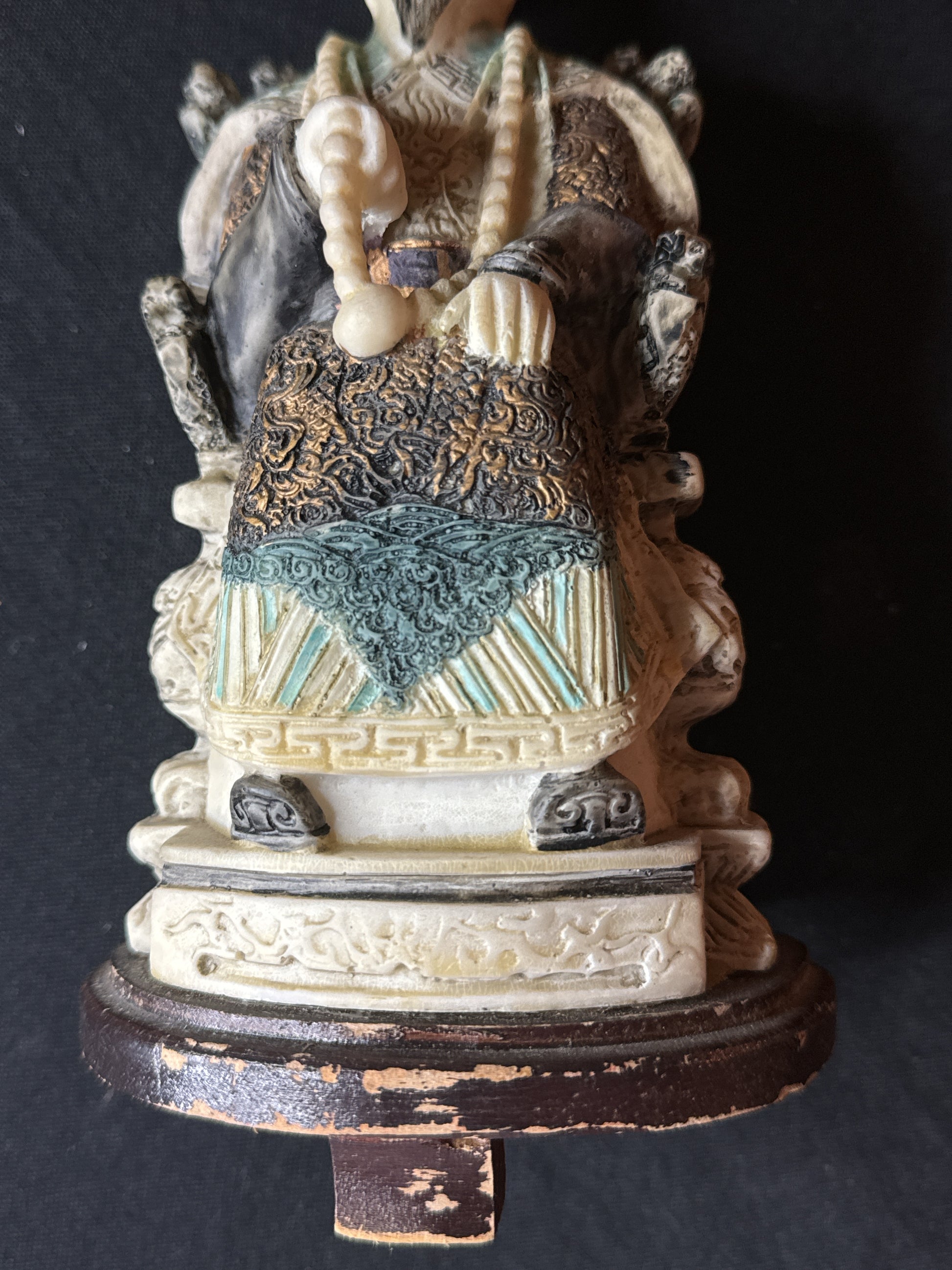Vintage Chinese Emperor & Empress Resin Statues Figurines Made in Taiwan. Missing little pieces on tops of heads. Not sure what it was for. Empress has chip in upper left portion of chair and small chip on top of hat.
