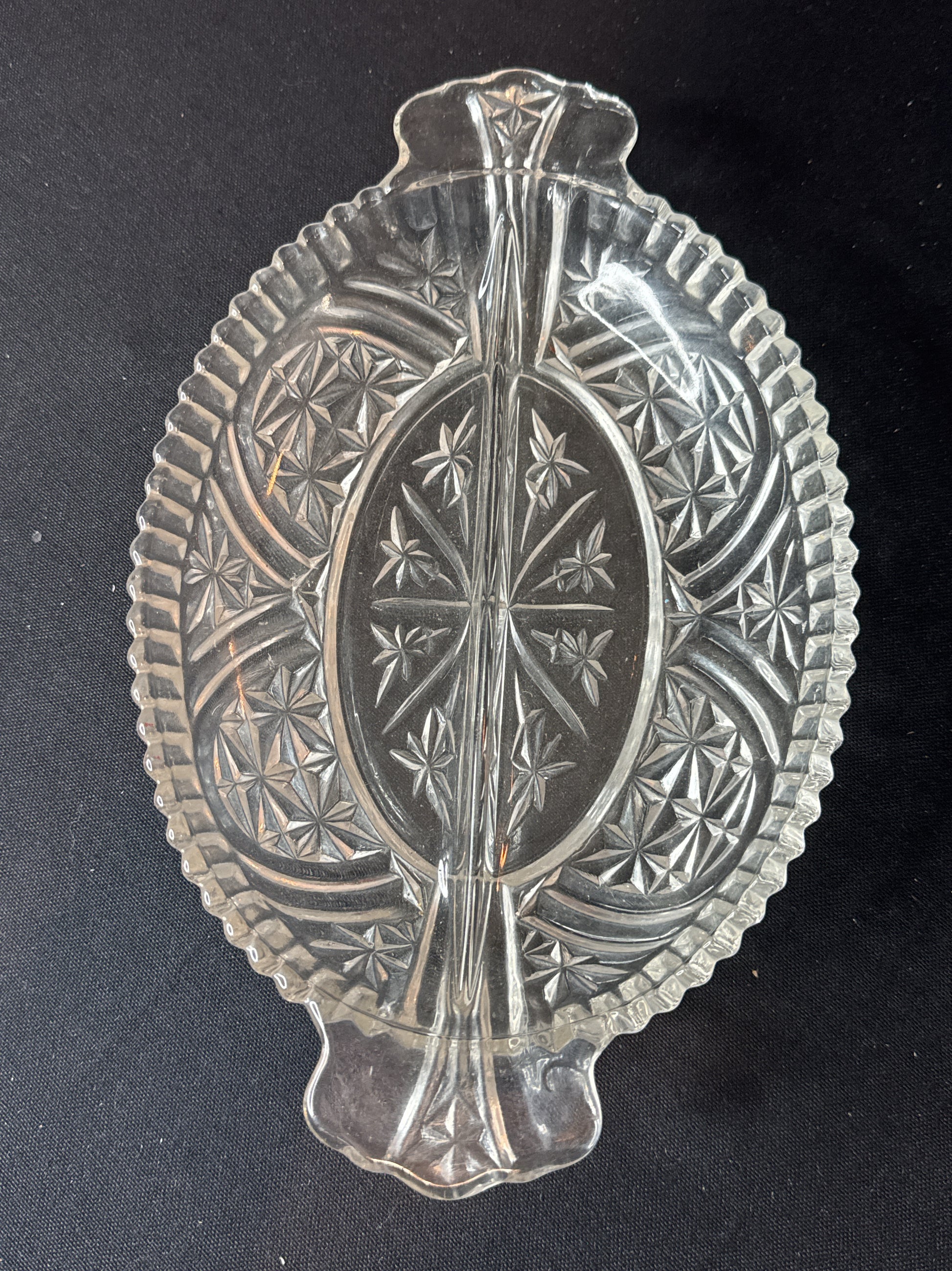 Vintage Divided Clear Pressed Glass Sawtooth Relish Candy Dish w/ Handles 10" Long. 6.25" Wide. Excellent condition, no chips or cracks.