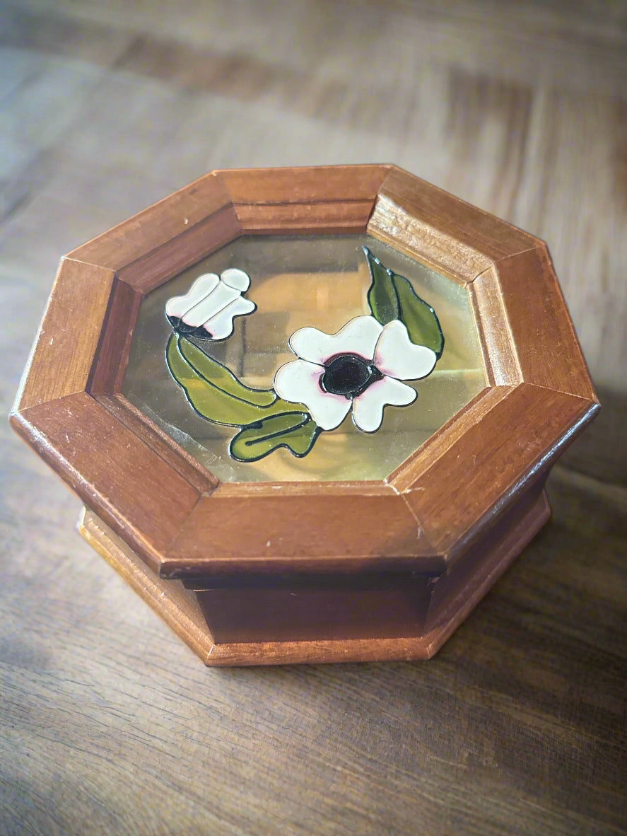 Vintage Gunther Male Wood/Stained Glass Jewelry/Trinket Box - Floral Octagonal 5.5" Wide