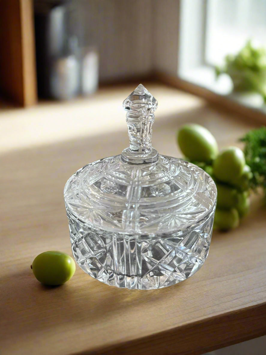 Vintage Hand Cut Crystal Bon Bon Dish Trinket Dish Glass Bowl w/ Lid 1.5" Tall Container 4.5" Total