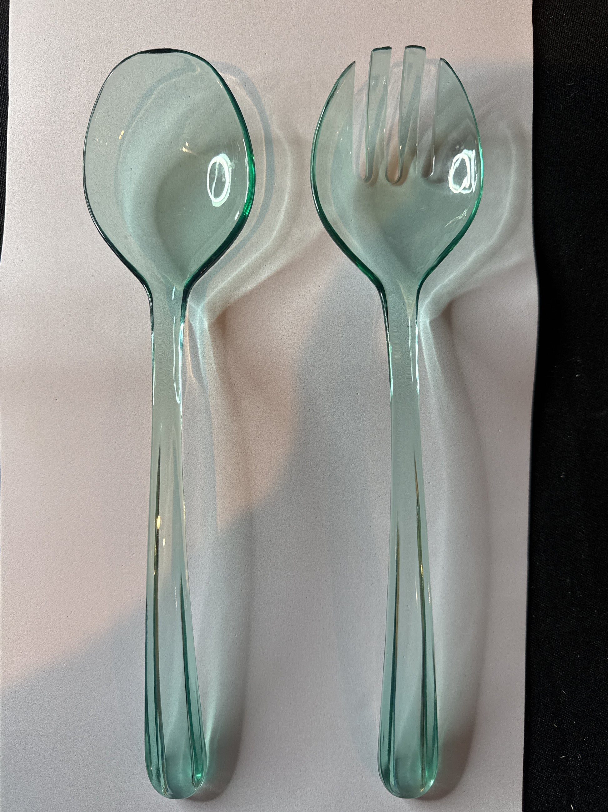 Vintage Lucite Acrylic Teal Aqua Mermaid Green Salad Serving Utensils 11" Long. Light wear but no damage.