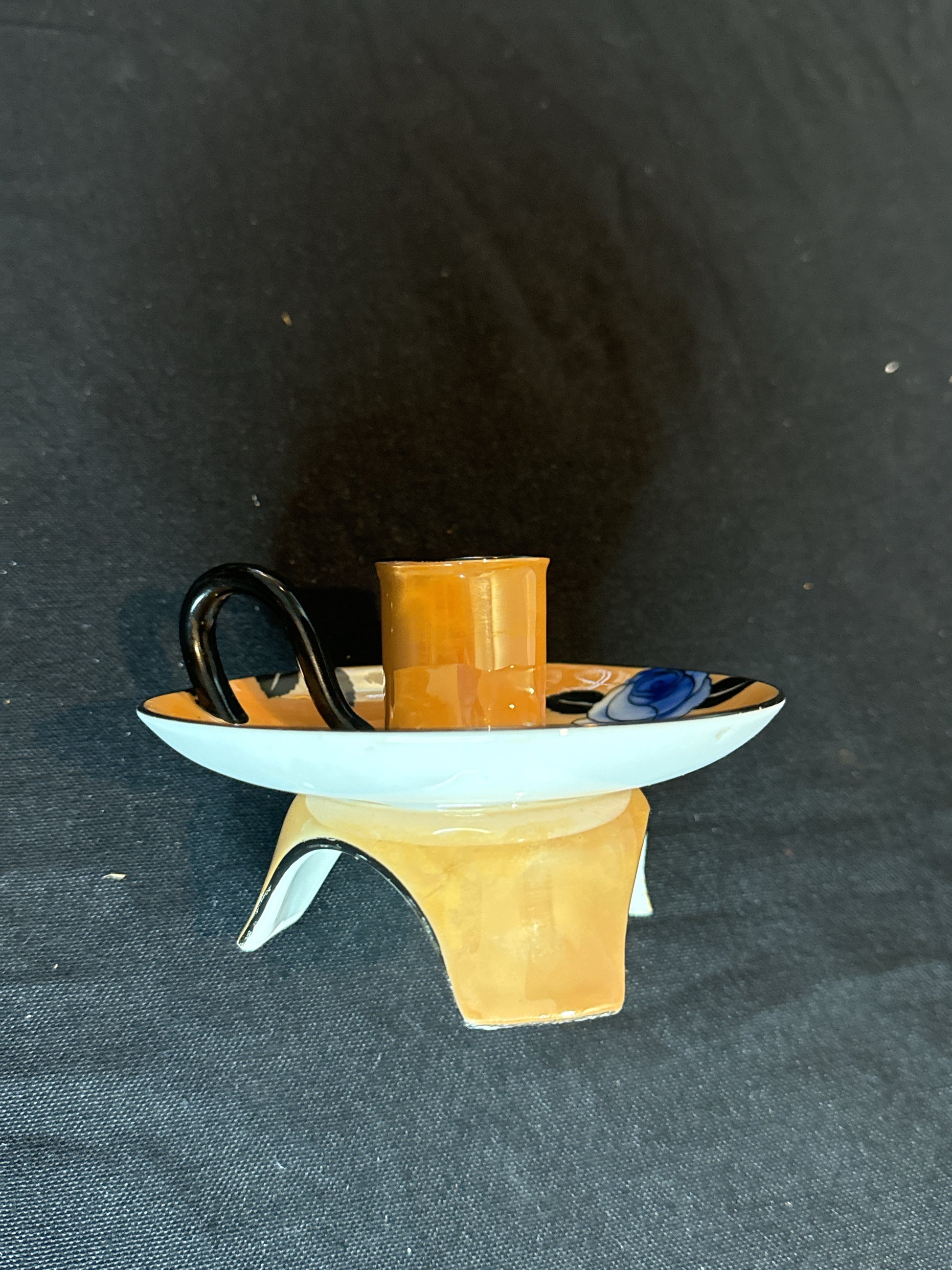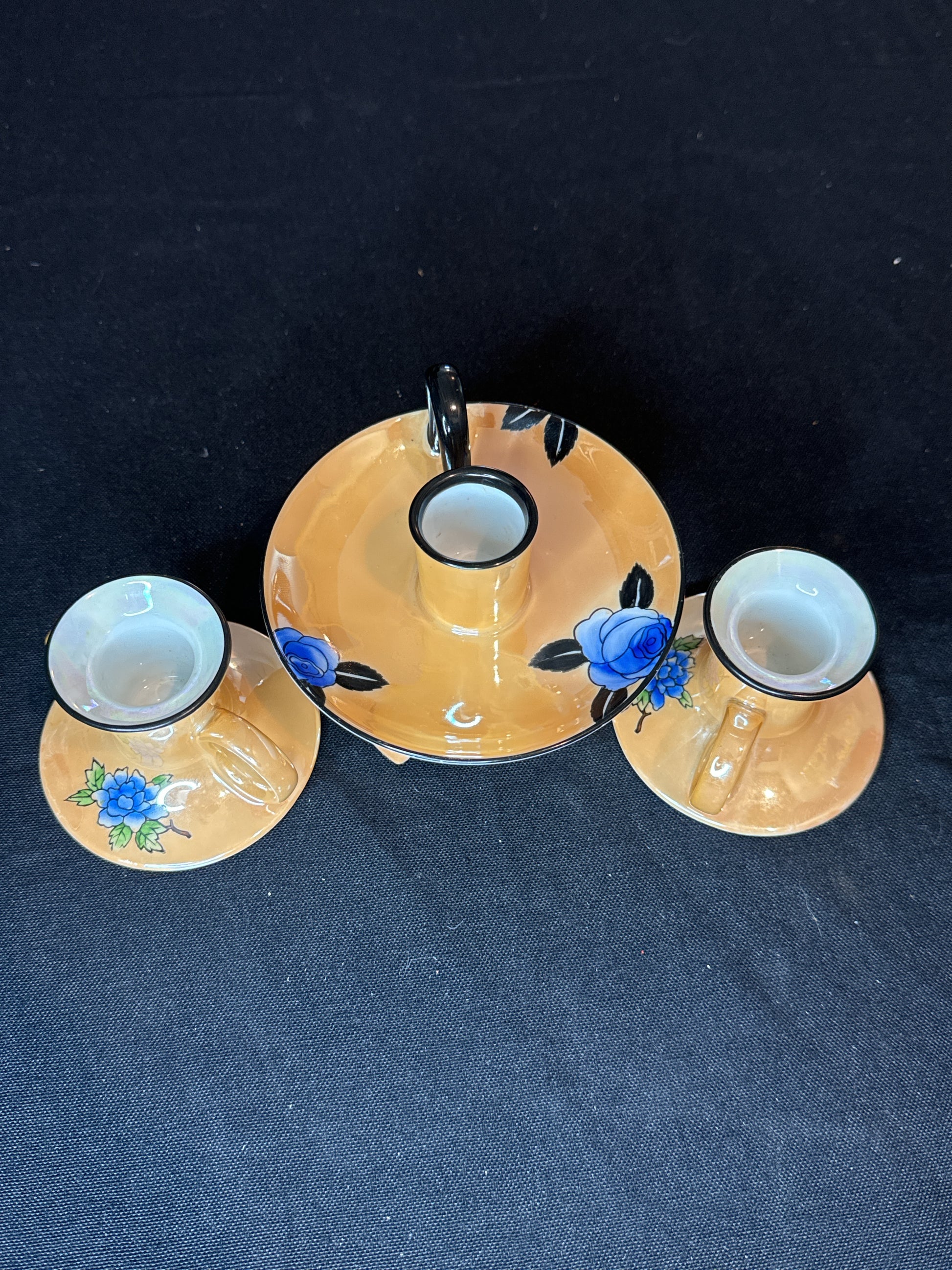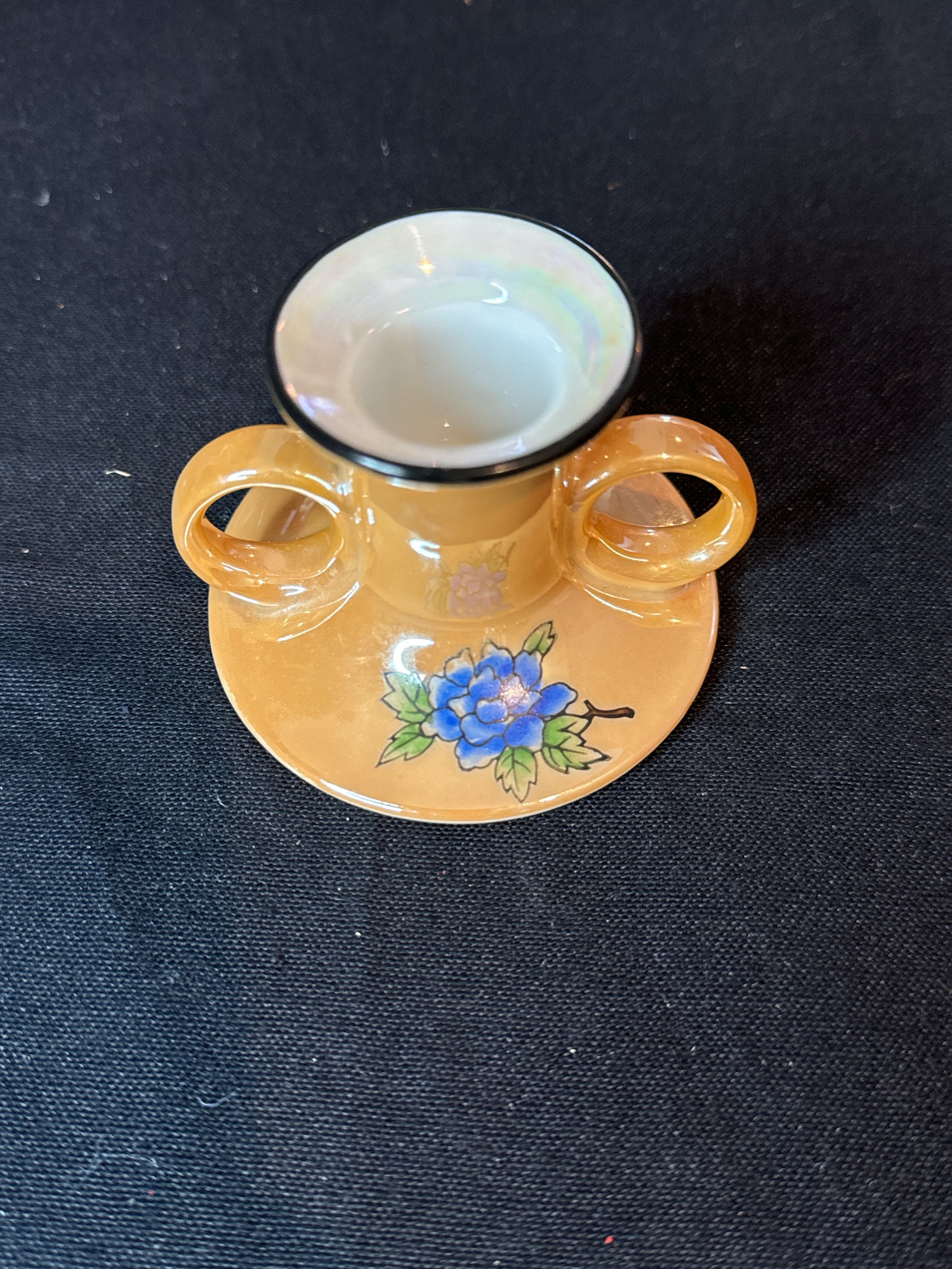 Vintage Noritake Candle Stick Holders 1 Footed and 2 Non-Footed Lusterware. Hand painted, made in Japan. Diameter of footed 4.5". Double handle Pair of non-footed holders 3" Diameter. Excellent condition, no chips or cracks.