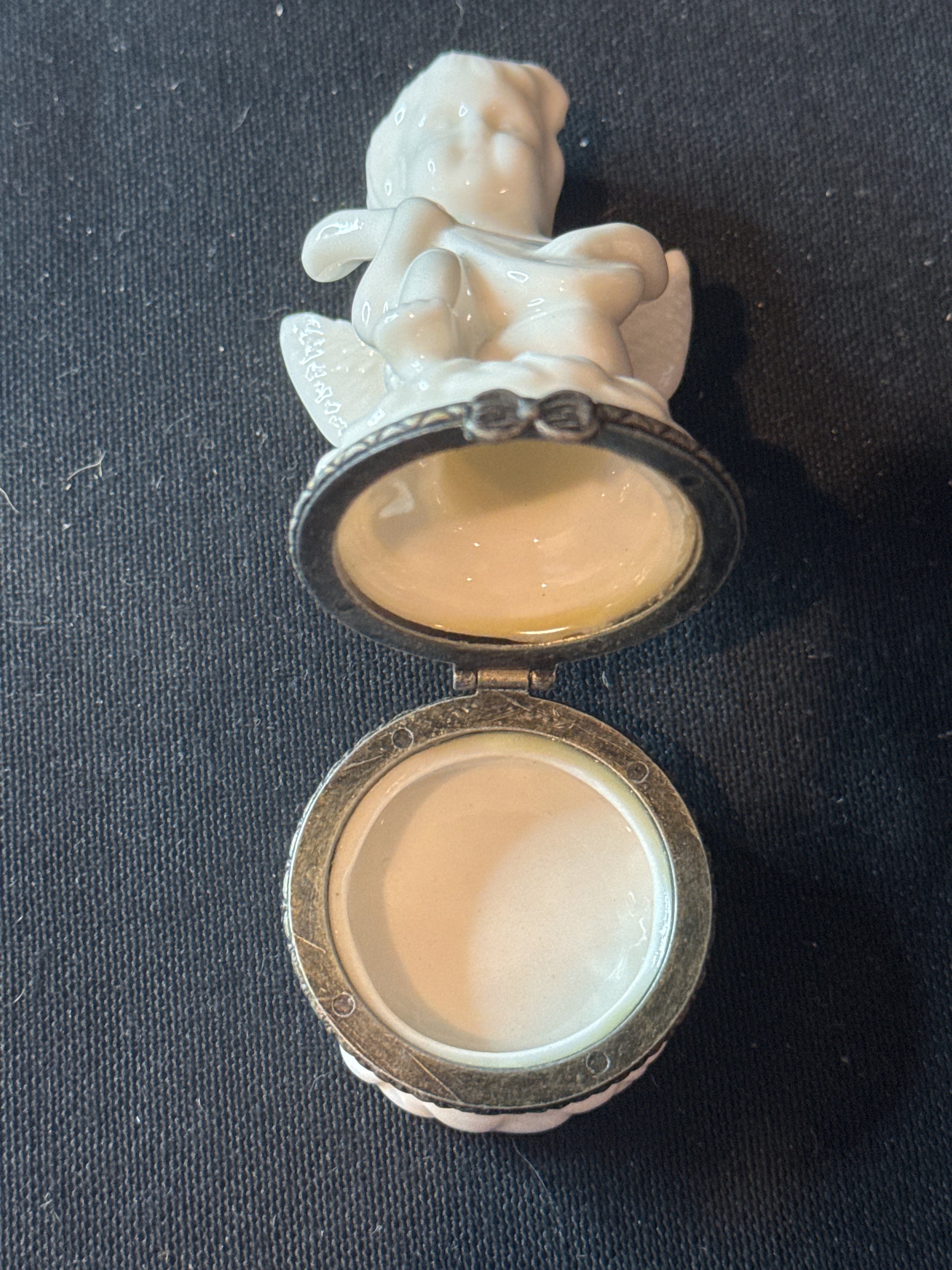 Vintage Porcelain Cherub Figurine Trinket Box Playing a Lute 3.5" Tall and 1.5" Width