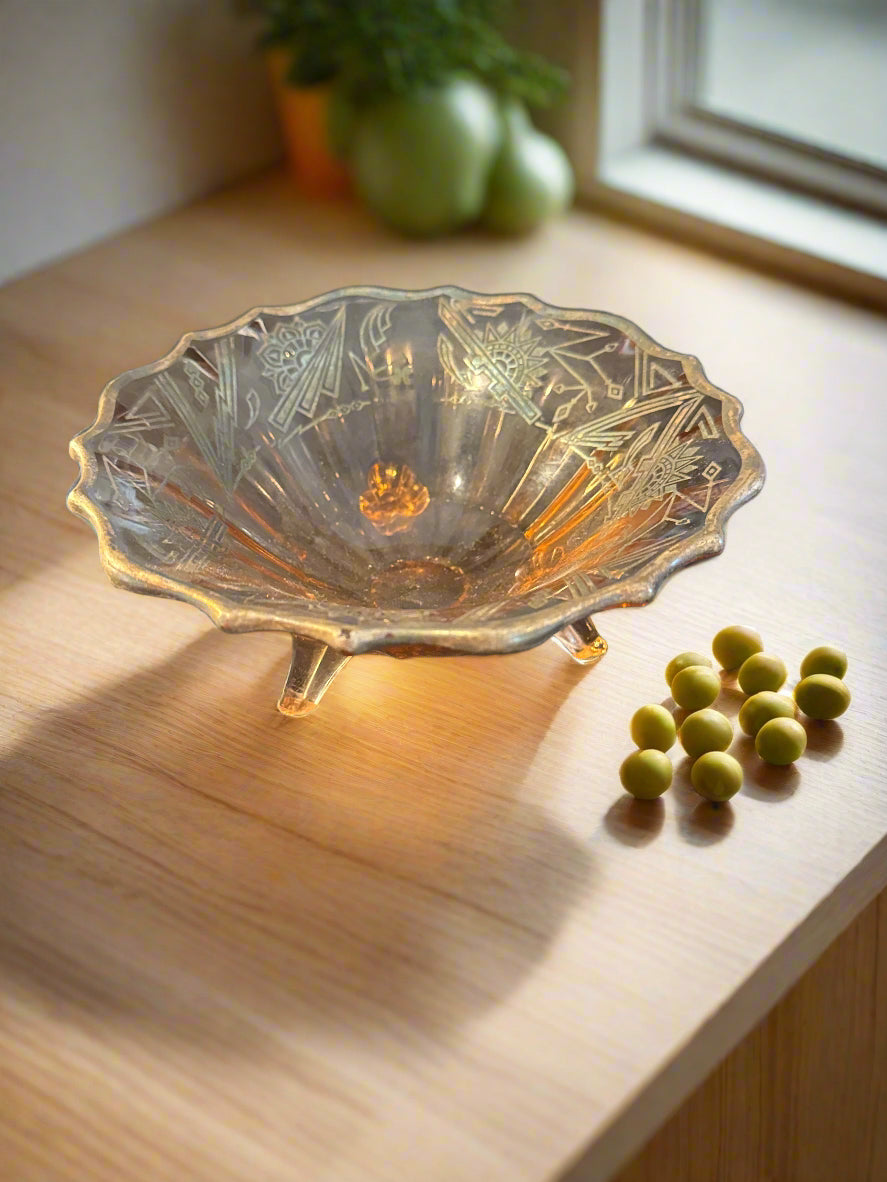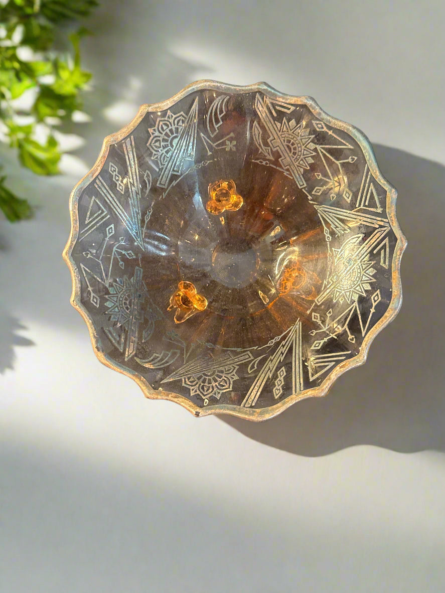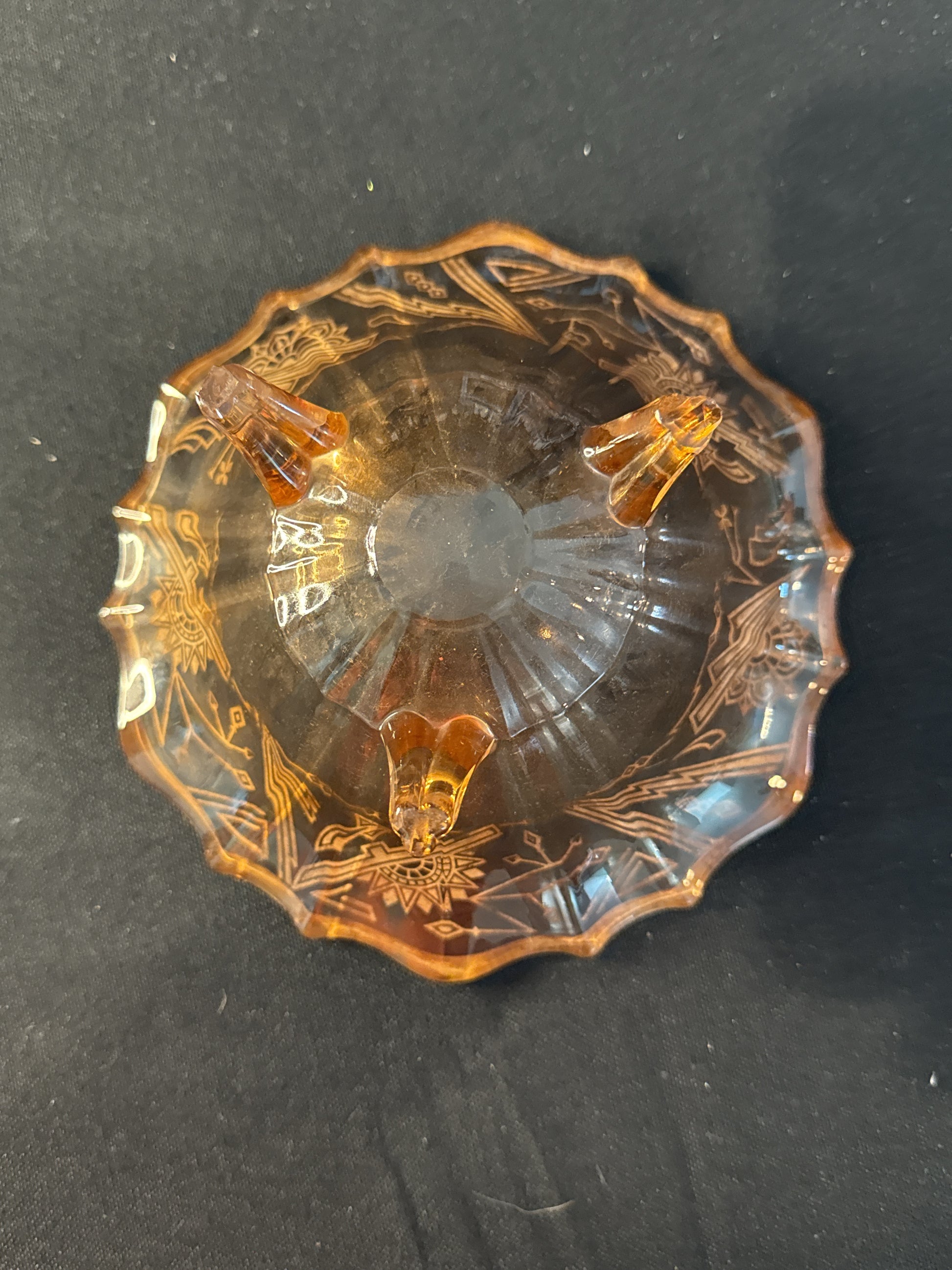 Vintage Three Footed Amber Glass Bowl with Sterling Silver Inlay Designs 6" Wide x 2.25" T